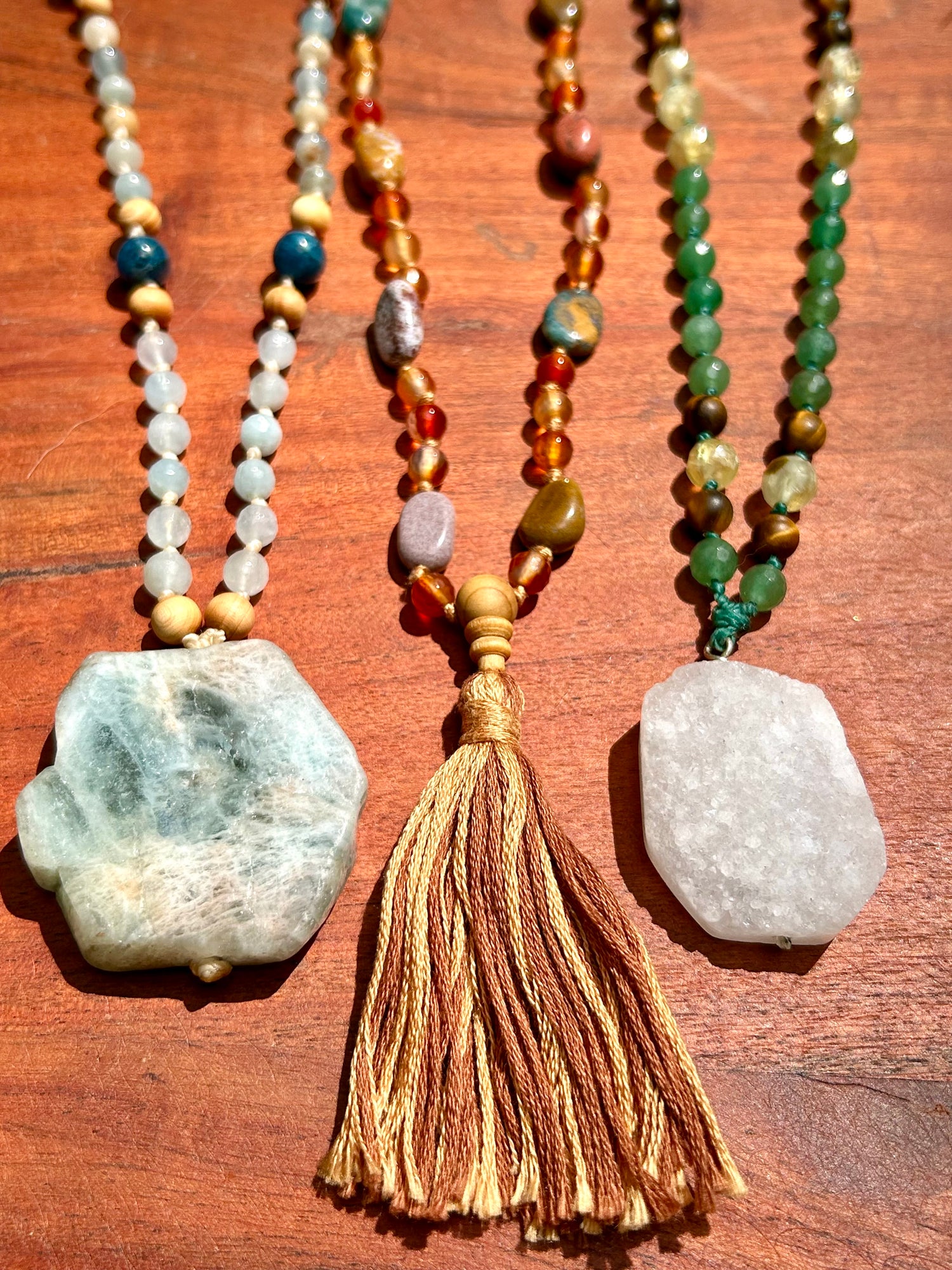 Each mala is carefully designed and hand knotted with a gemstone or handmade tassel in the center. Every mala is unique and the same one will never be made again.