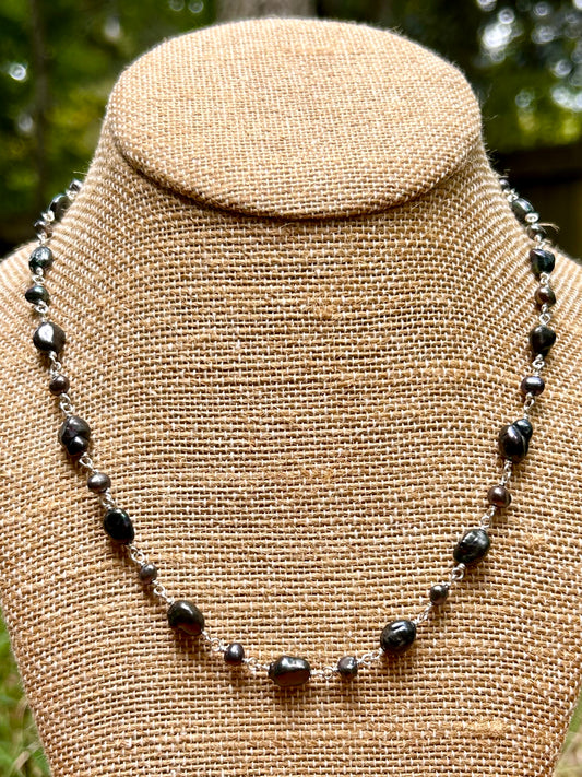 Black Freshwater Pearl Sterling Silver Chain Link Wire Wrapped Necklace