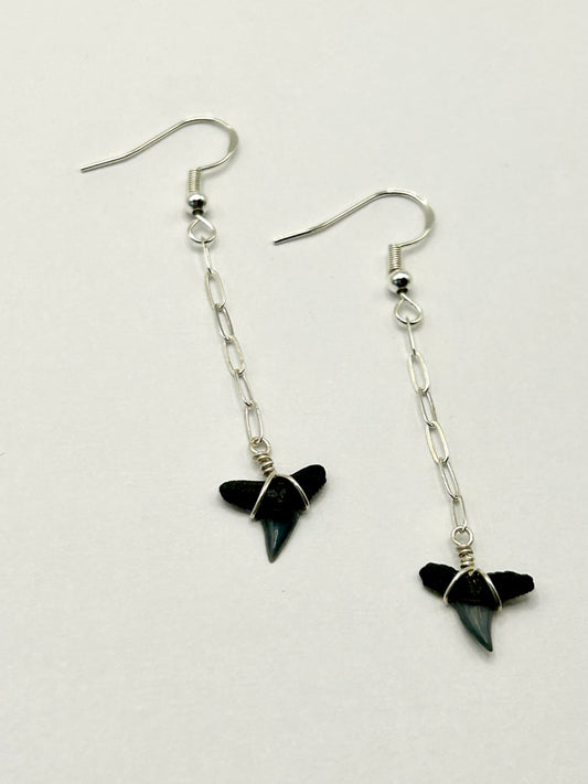 Shark Tooth Fossil with Paperclip Chain Sterling Silver Dangly Earrings