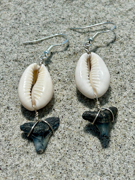Shark Tooth Fossil with Cowrie Shell Gemstone Sterling Silver Dangly Earrings