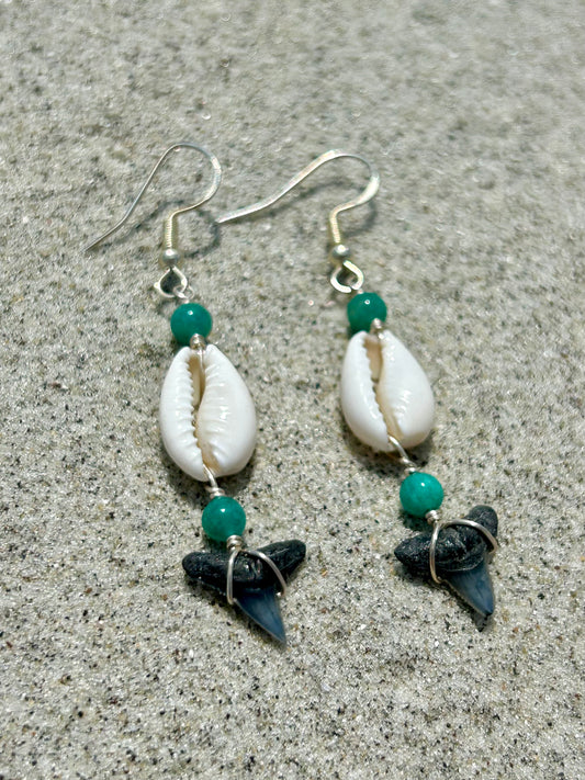 Shark Tooth Fossil with Cowrie Shell & Amazonite Gemstone Sterling Silver Dangly Earrings