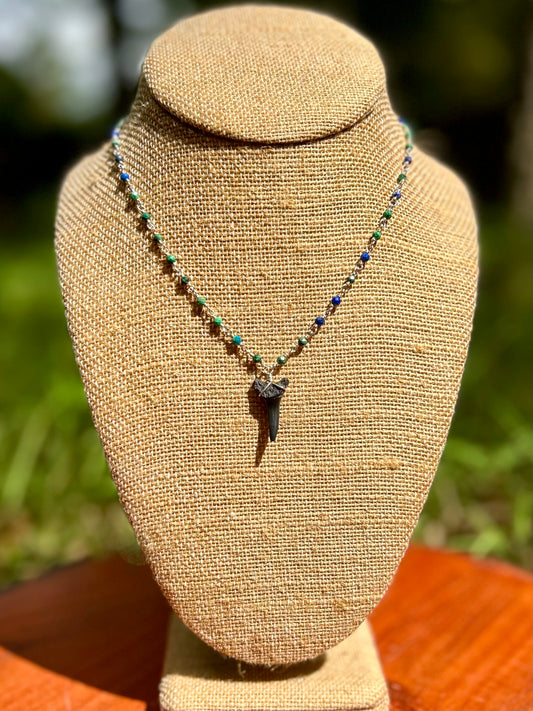 Shark Tooth Fossil with Azurite Gemstone Sterling Silver Chain Link Wire Wrapped Necklace