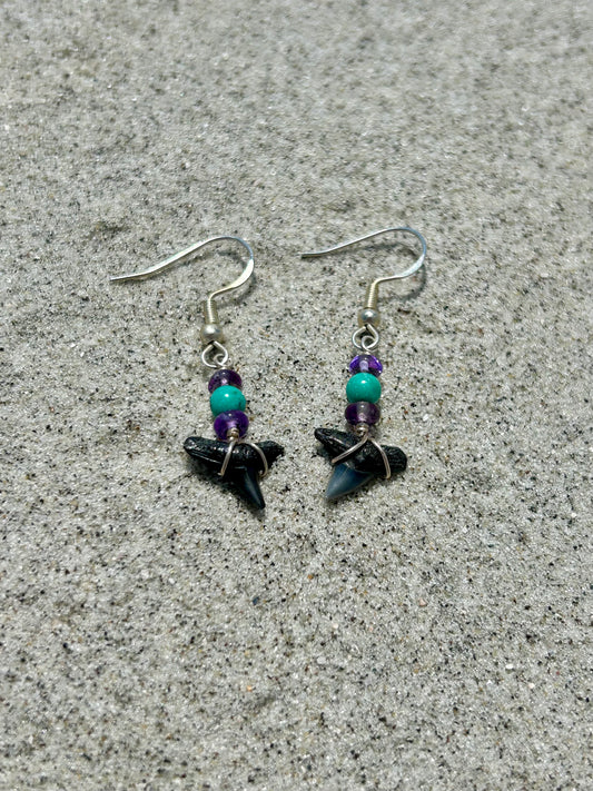 Shark Tooth Fossil with Amethyst & Turquoise Gemstone Sterling Silver Dangly Earrings