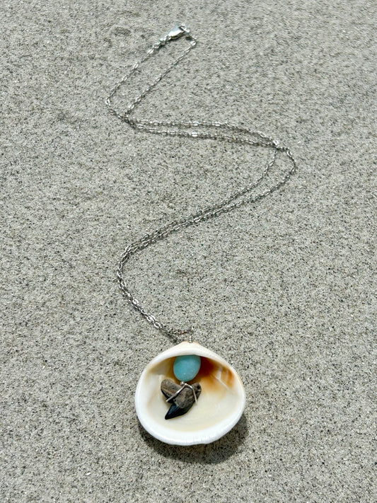 Shark Tooth Fossil, Clam Shell & Amazonite Gemstone Pendant Simple Sterling Silver Chain Necklace