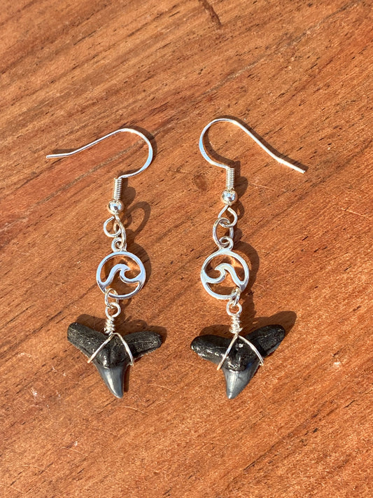 Shark Tooth Fossil with Ocean Wave Charms Sterling Silver Dangly Earrings