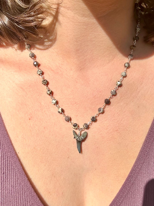 Shark Tooth Fossil with Mexican Orbicular Jasper Gemstone Sterling Silver Chain Link Wire Wrapped Necklace