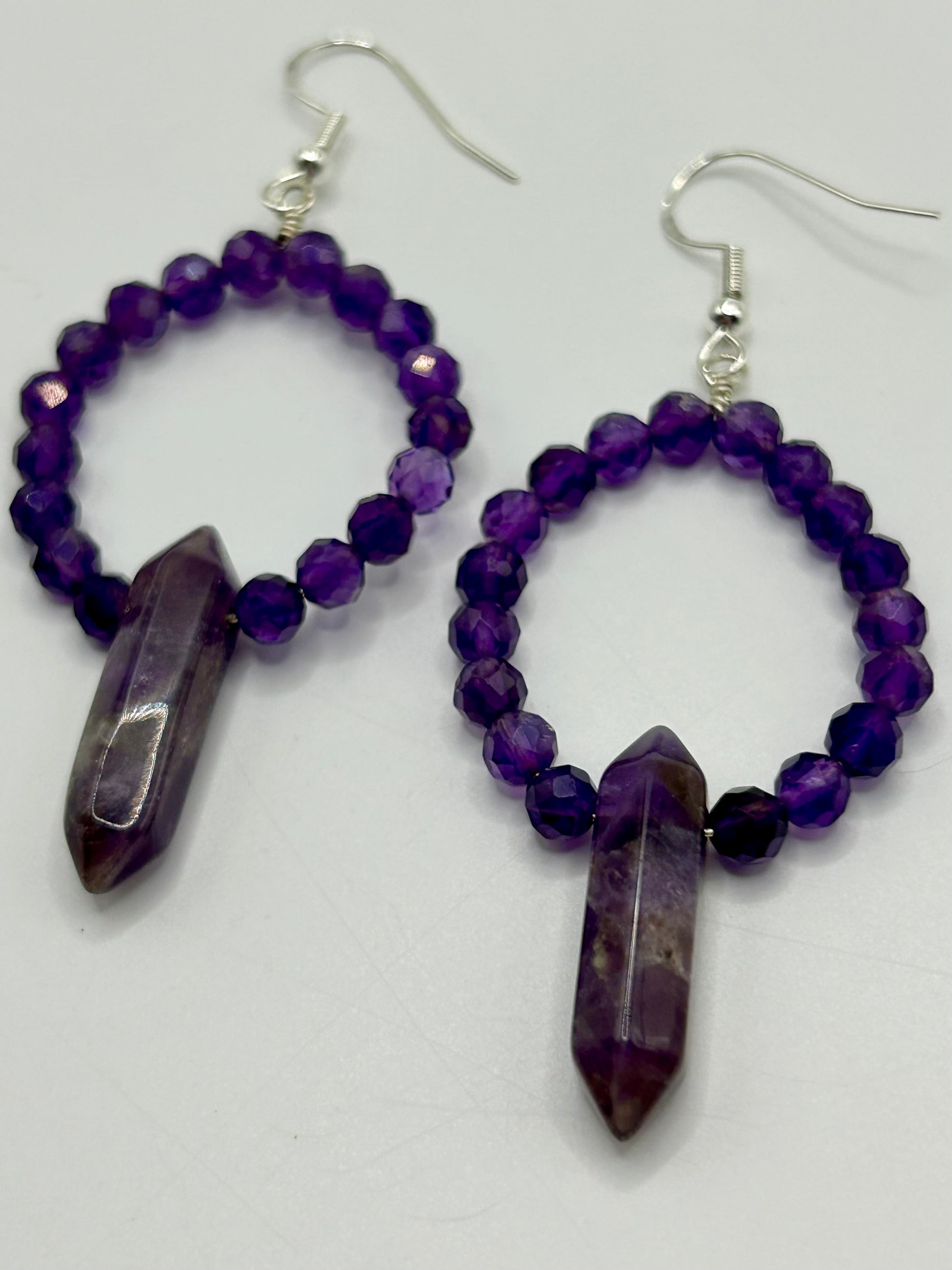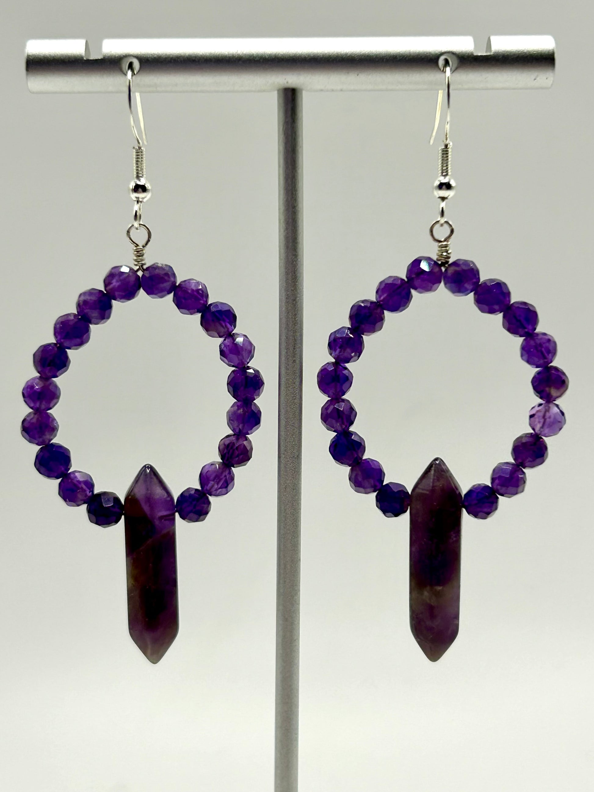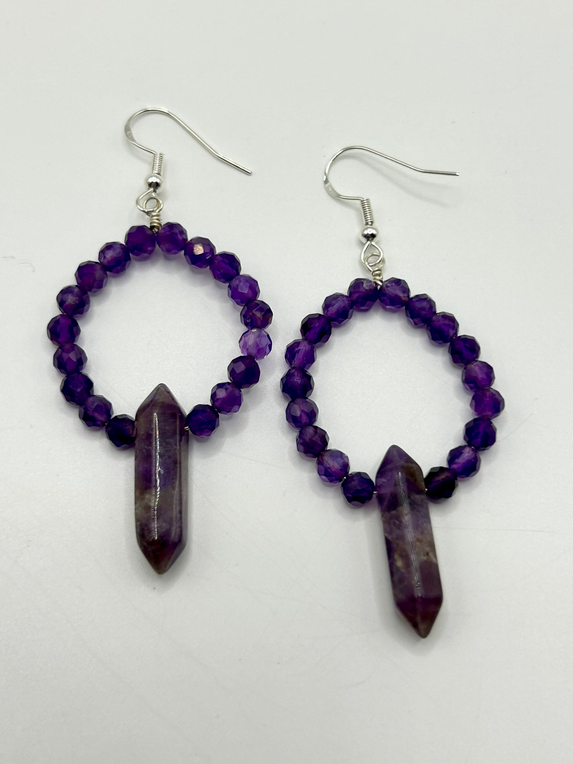 Dangly beaded hoop earrings with faceted Amethyst & double terminated Amethyst point gemstones