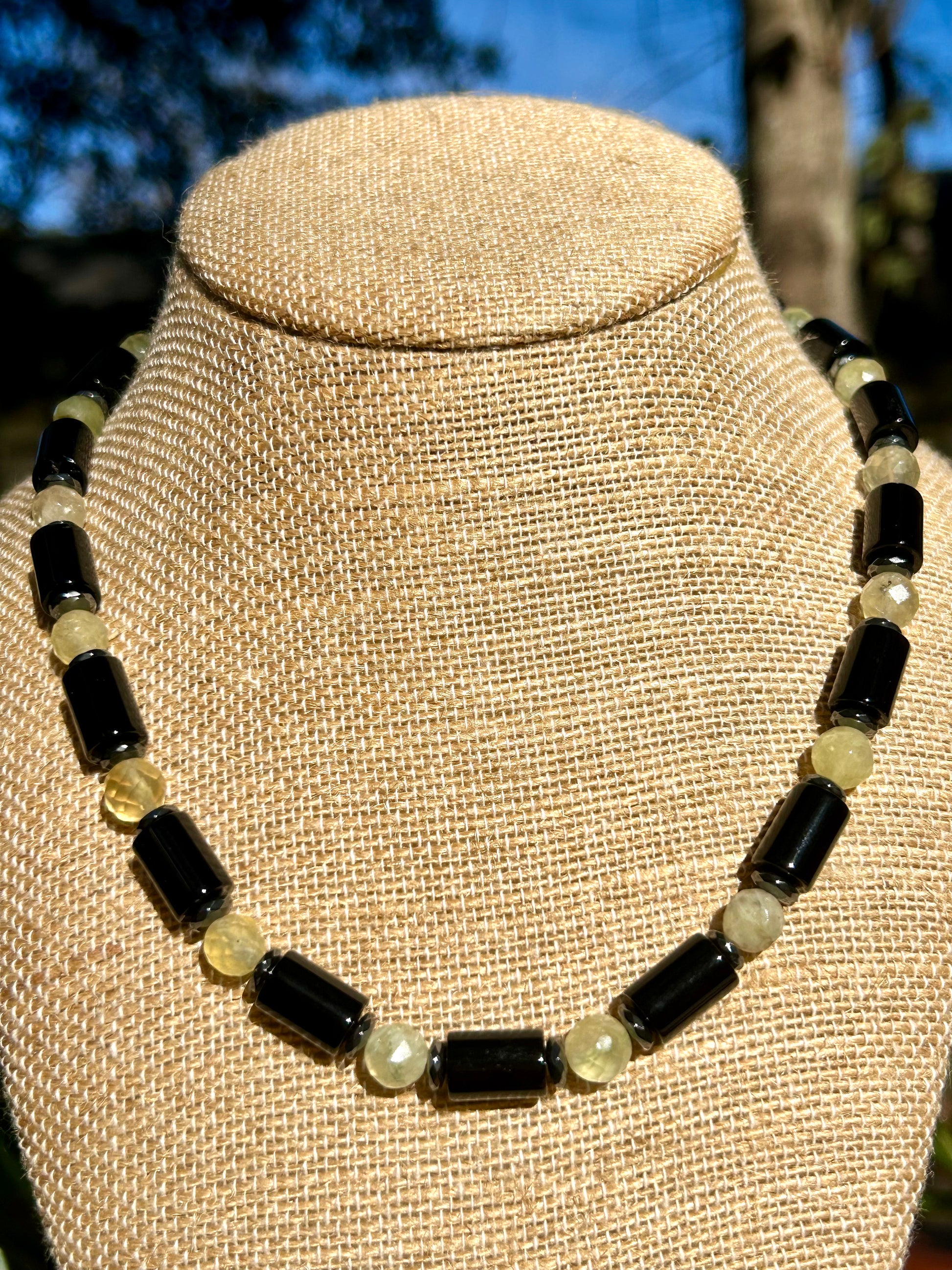 Beaded necklace with Black Onyx tube beads and faceted Prehnite round beads accented with Hematite spacers