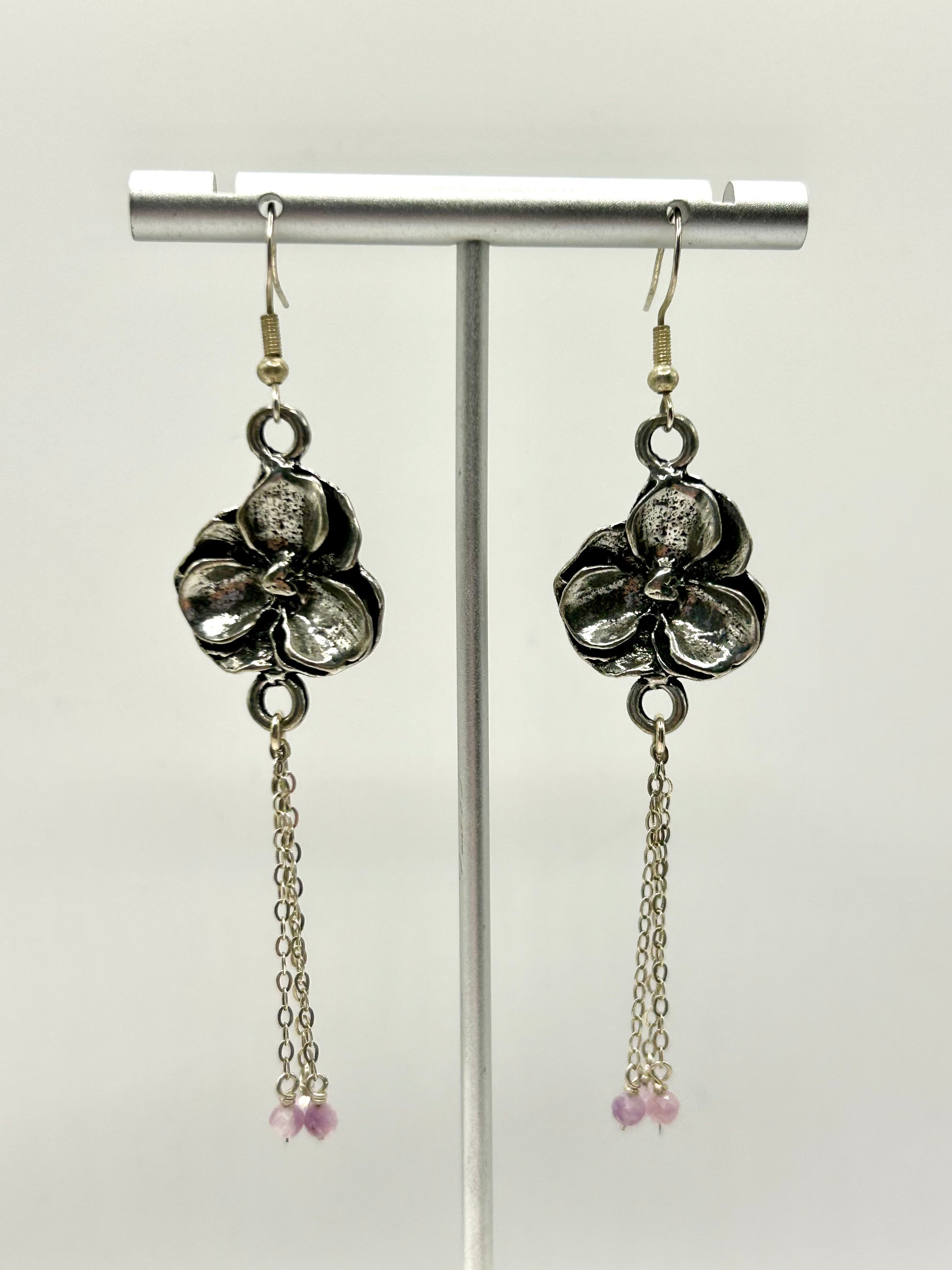 Dangly wire wrapped earrings with floral charms and mini Lepidolite gemstones falling from chains