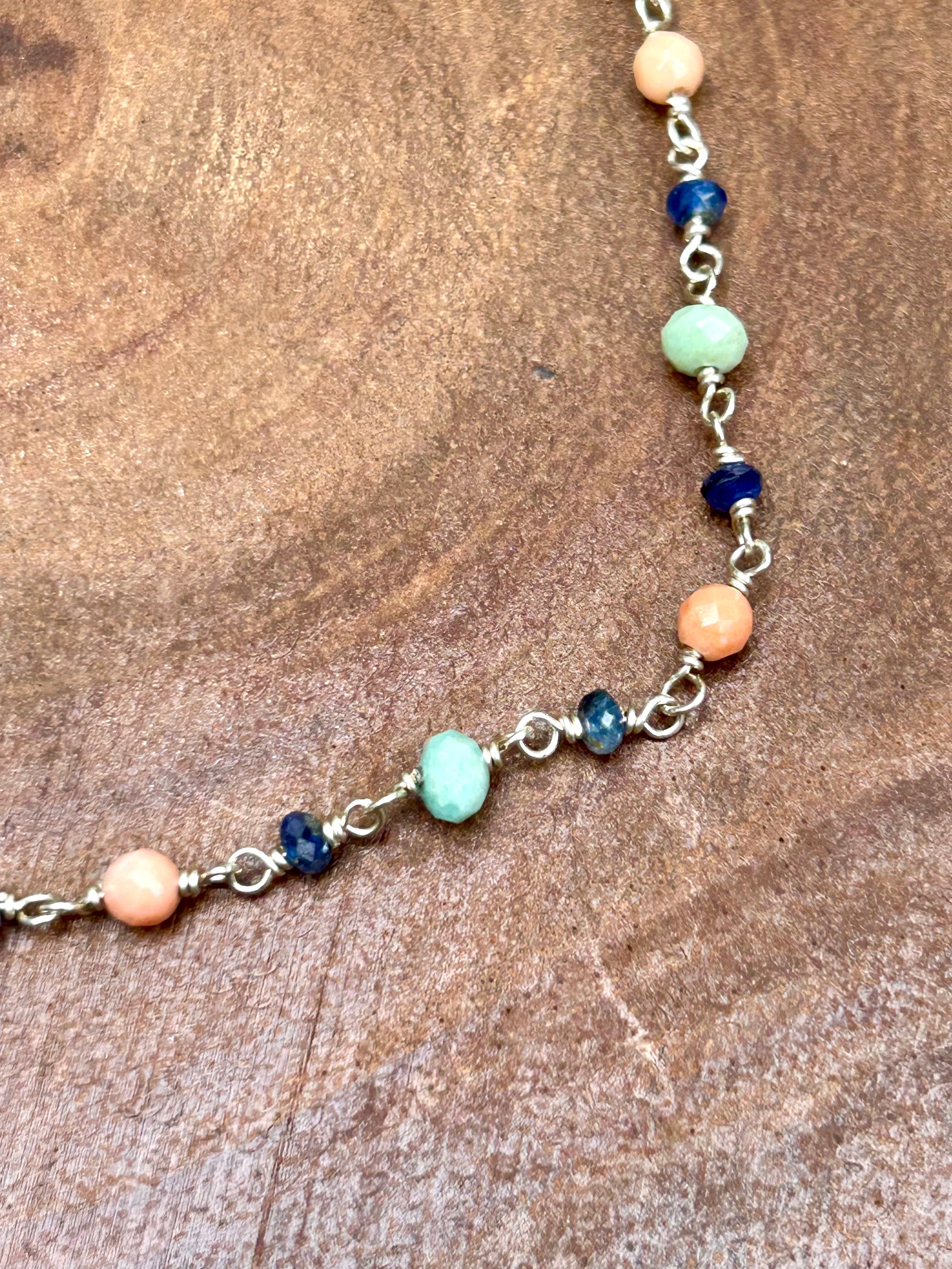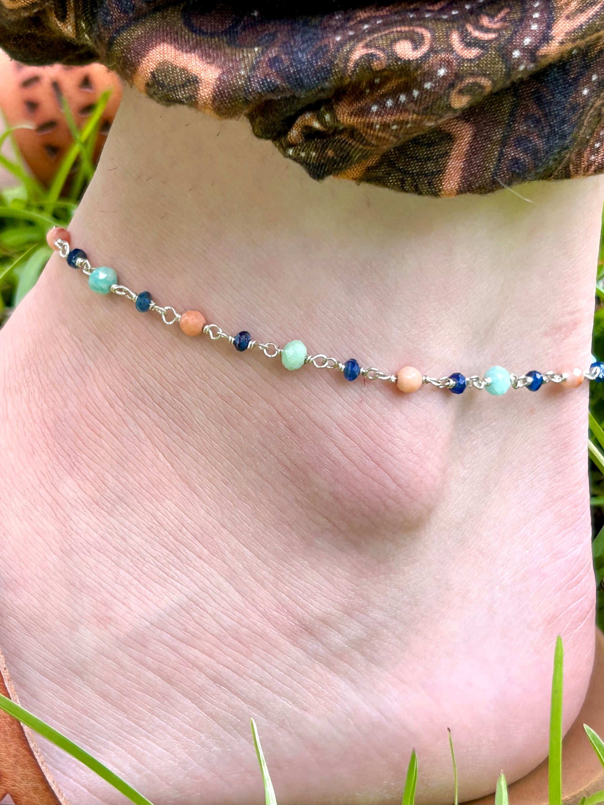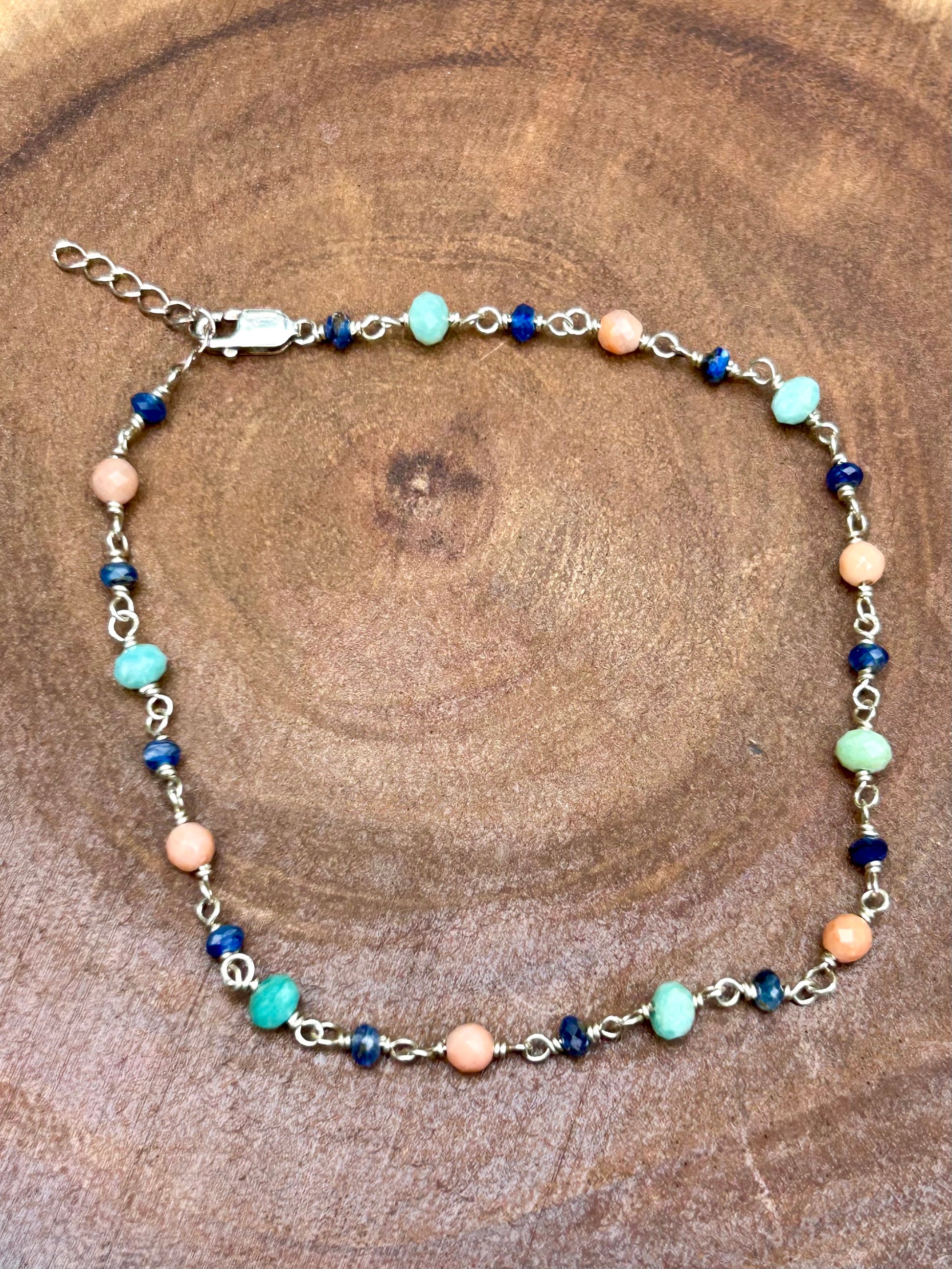 Chain link anklet made with Blue Kyanite, Amazonite, and Red Aventurine gemstone beads