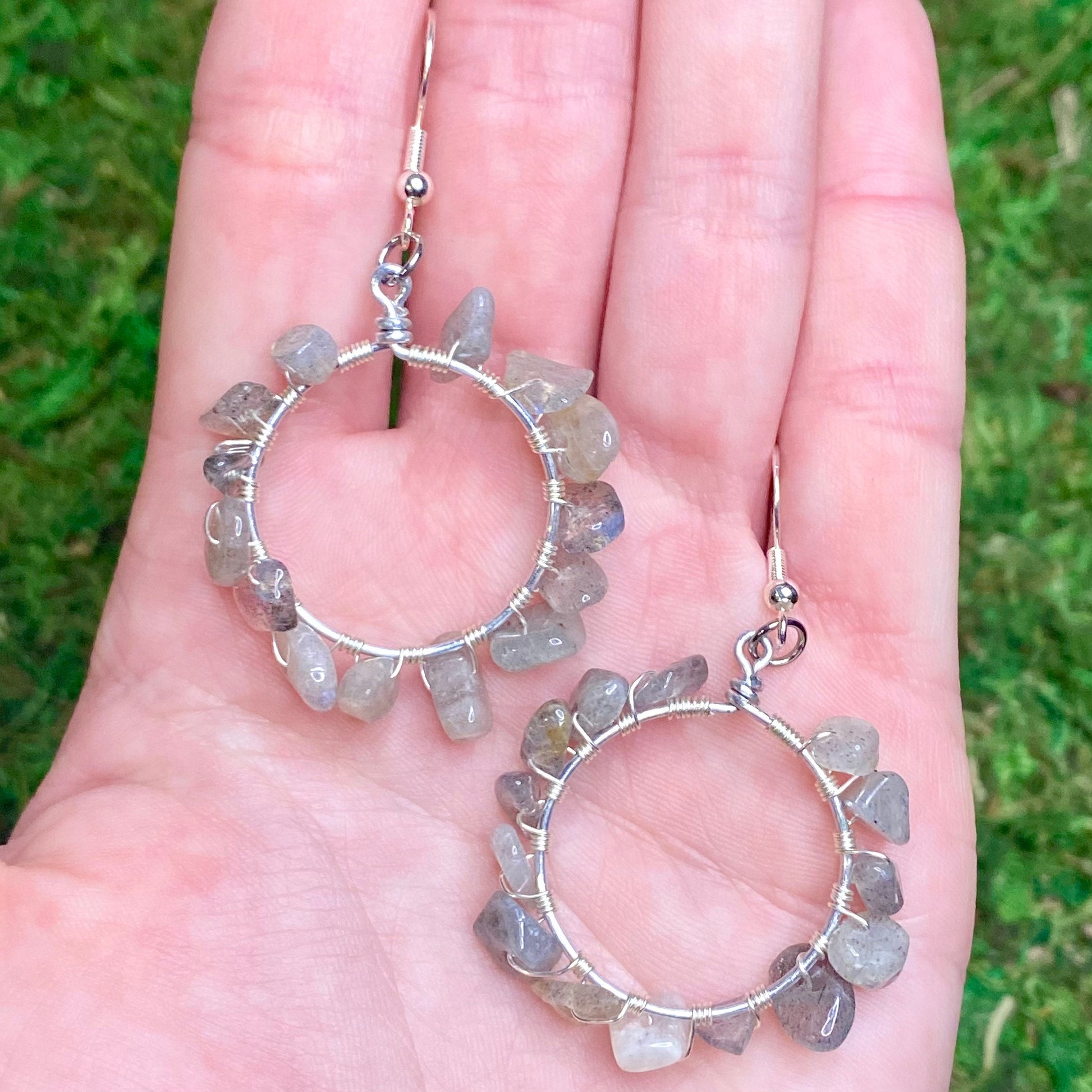 Dangly wire wrapped hoop earrings with labradorite gemstone chip beads