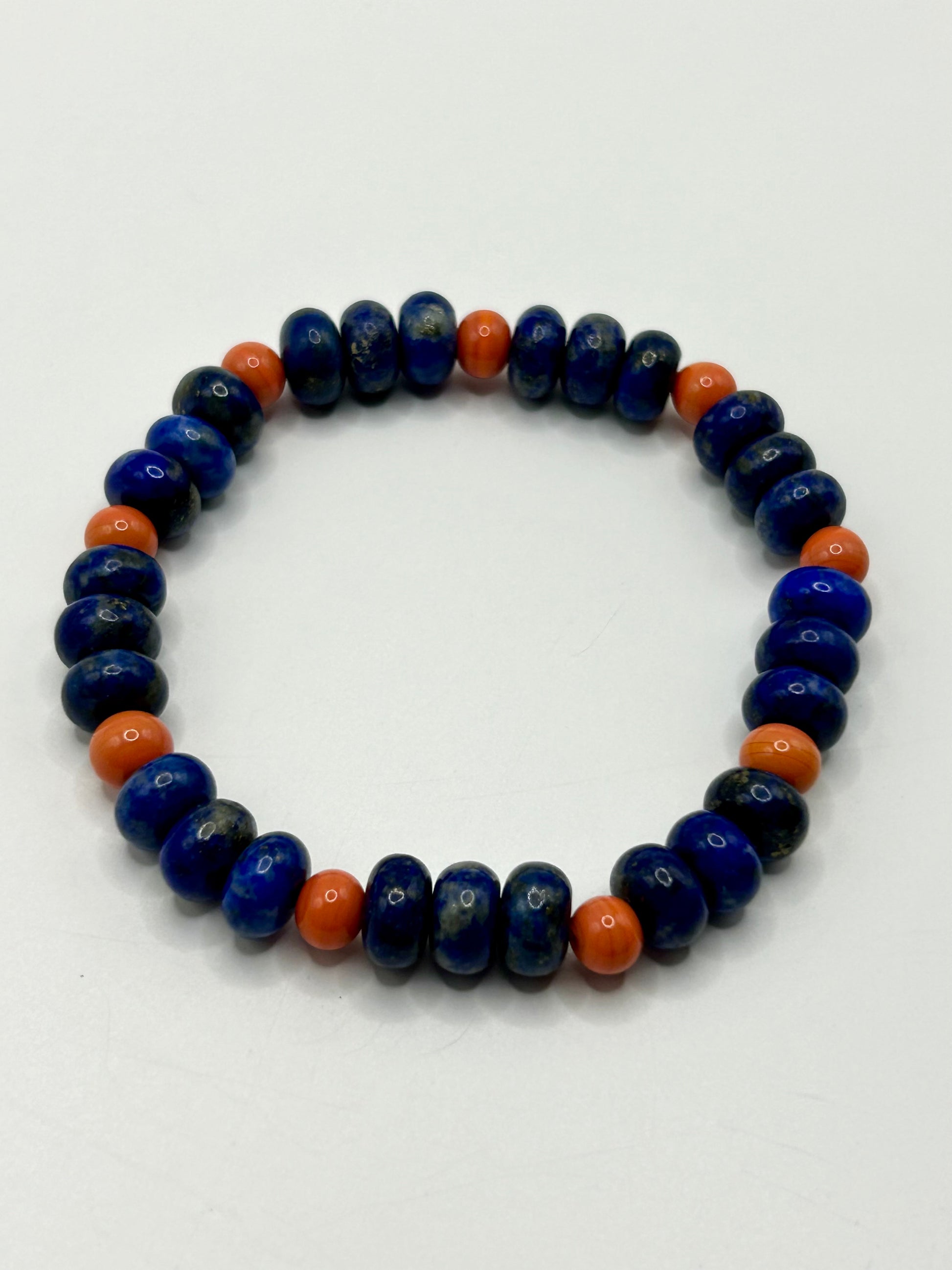 Beaded bracelet on elastic cord with Lapis Lazuli rondelles gemstones and round genuine Coral beads