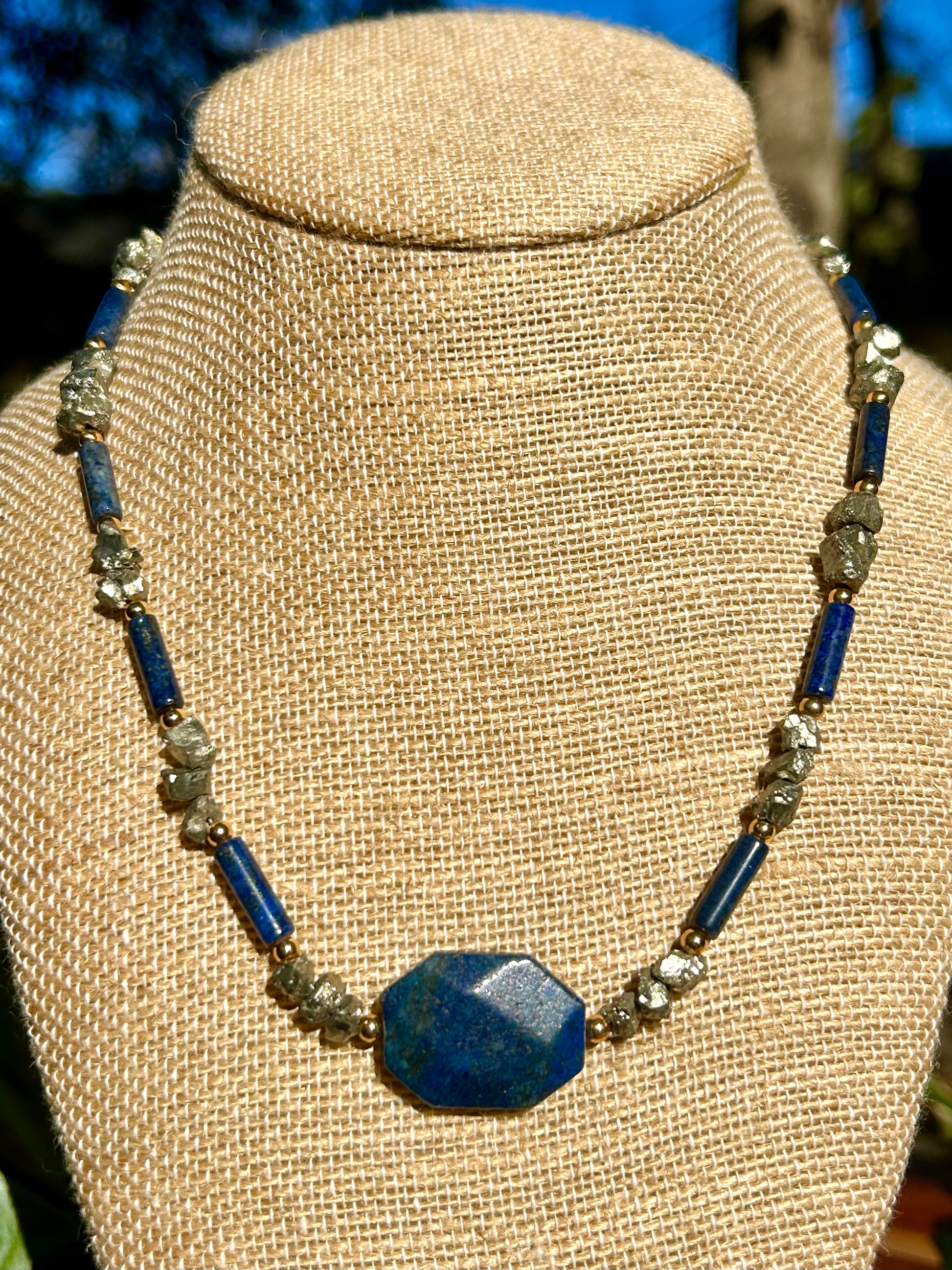 Lapis Lazuli & Pyrite with Gold Accents Beaded Necklace