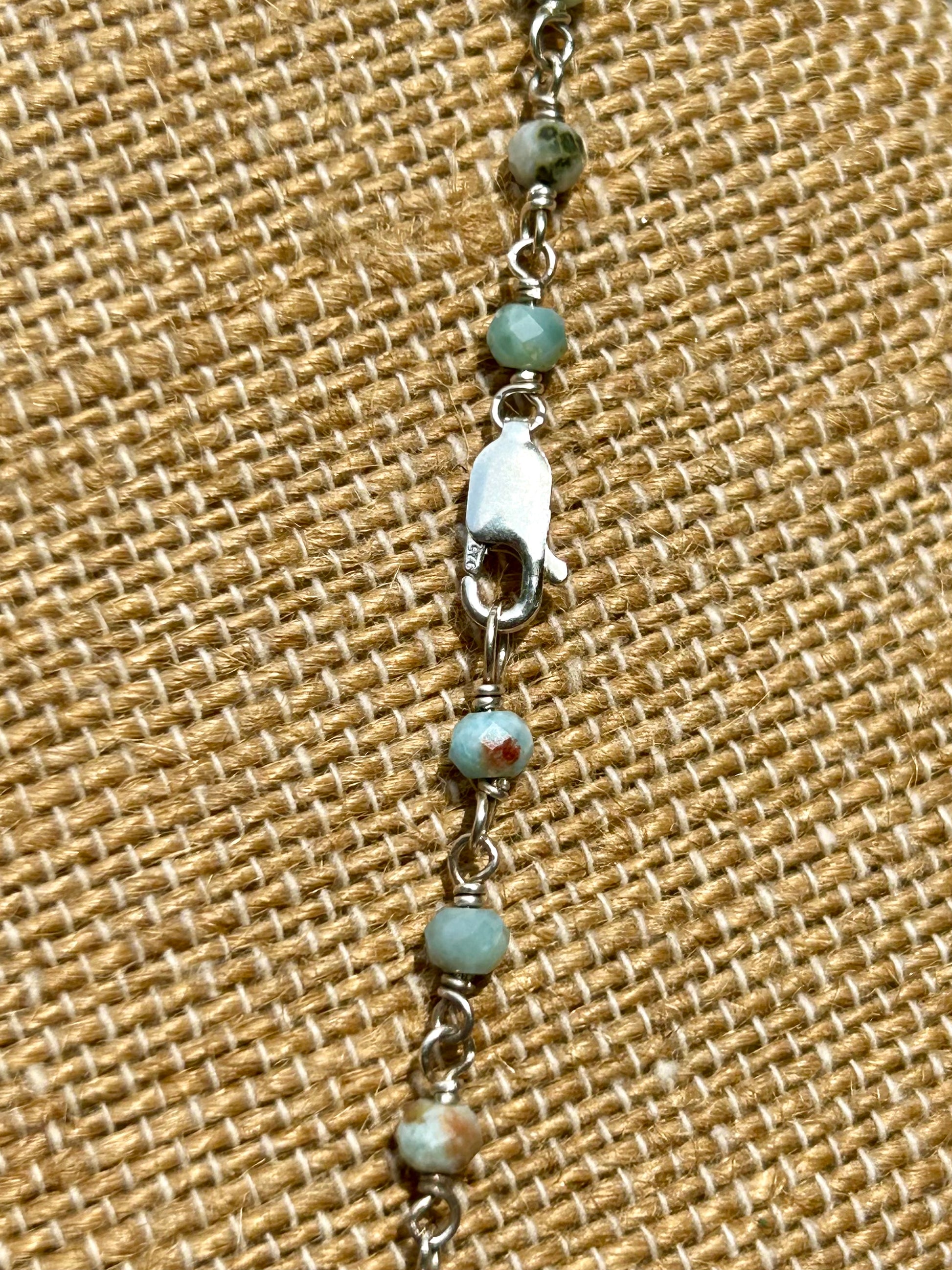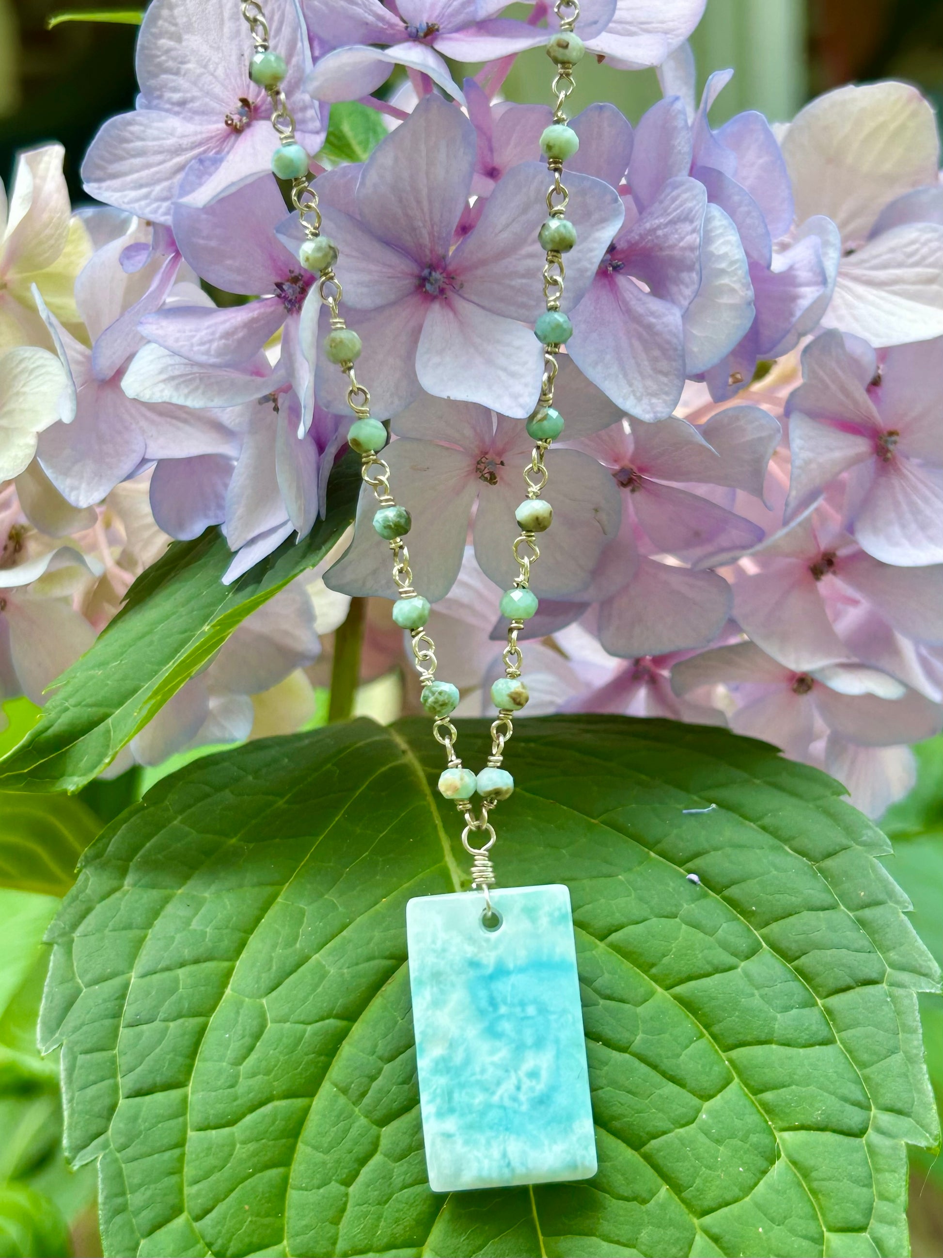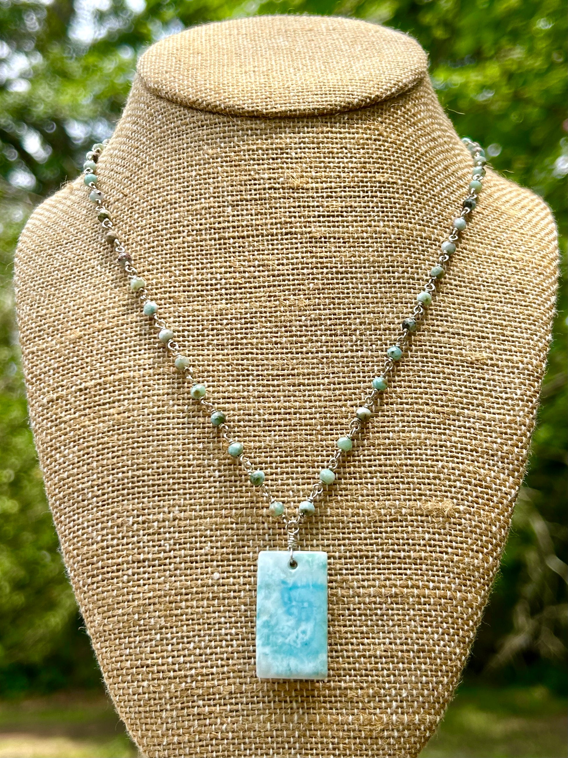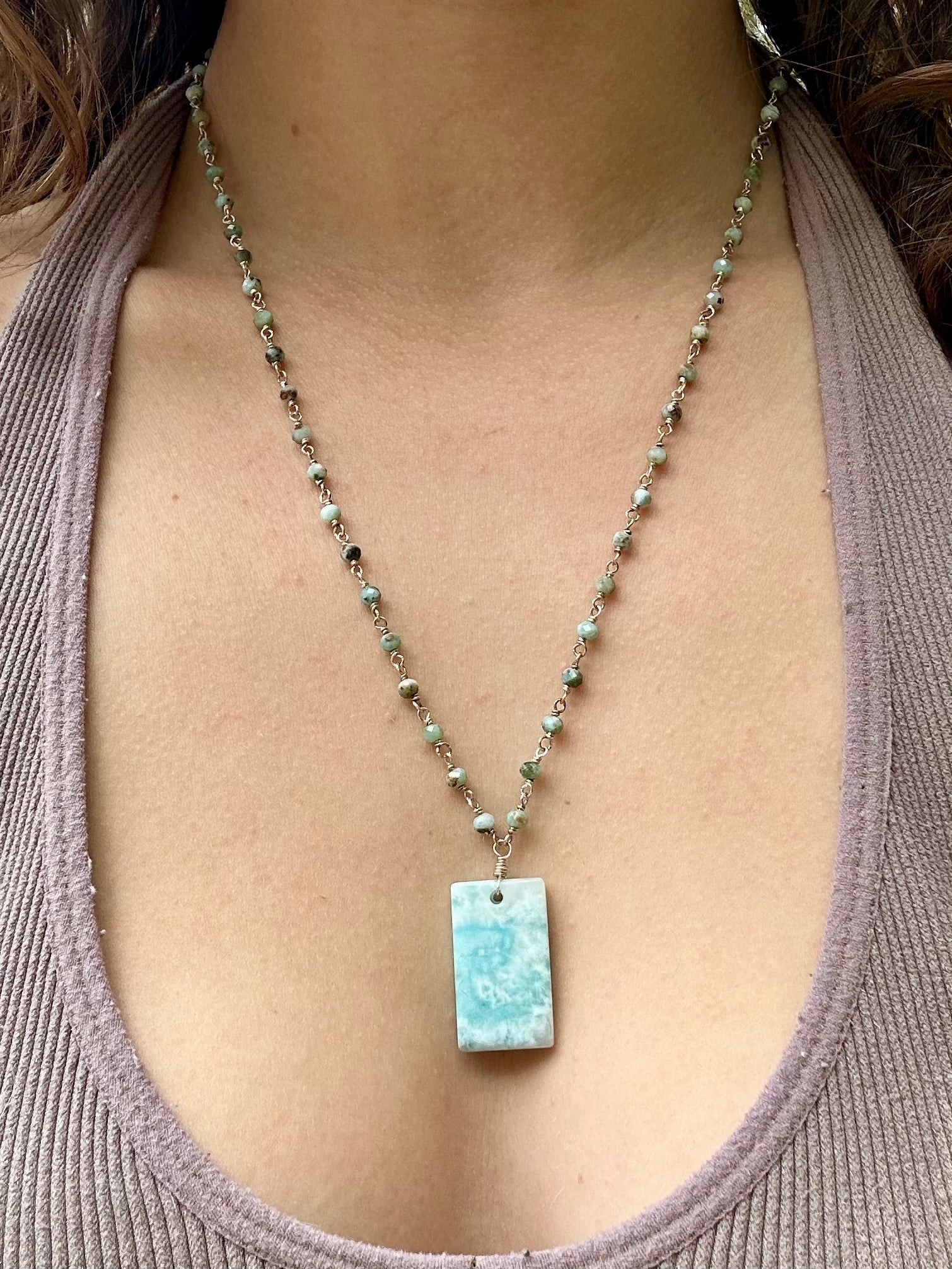Chain link necklace made with Larimar faceted gemstone beads and rectangle Larimar gemstone pendant