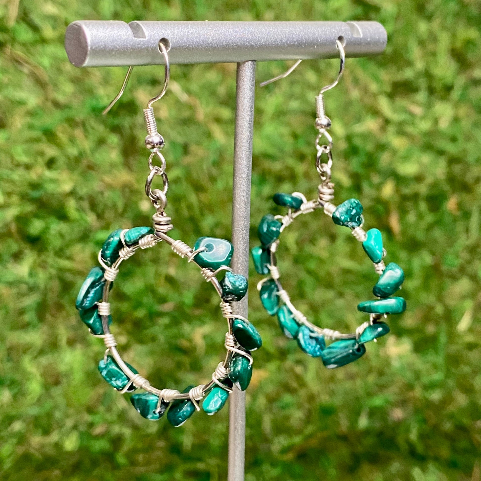 Dangly wire wrapped hoop earrings with malachite gemstone chips