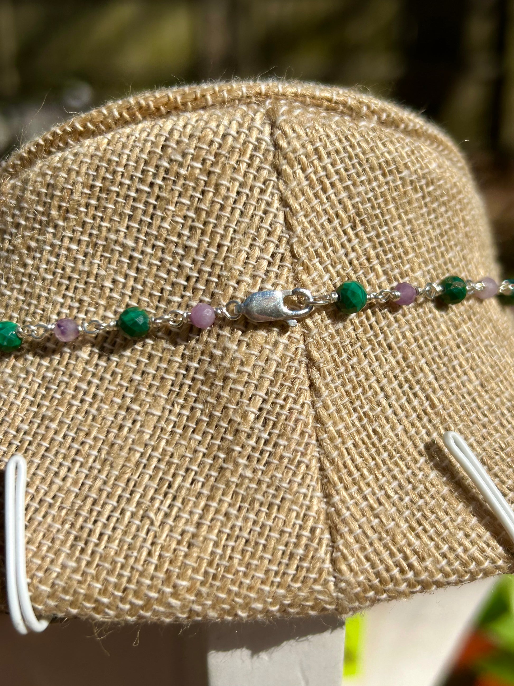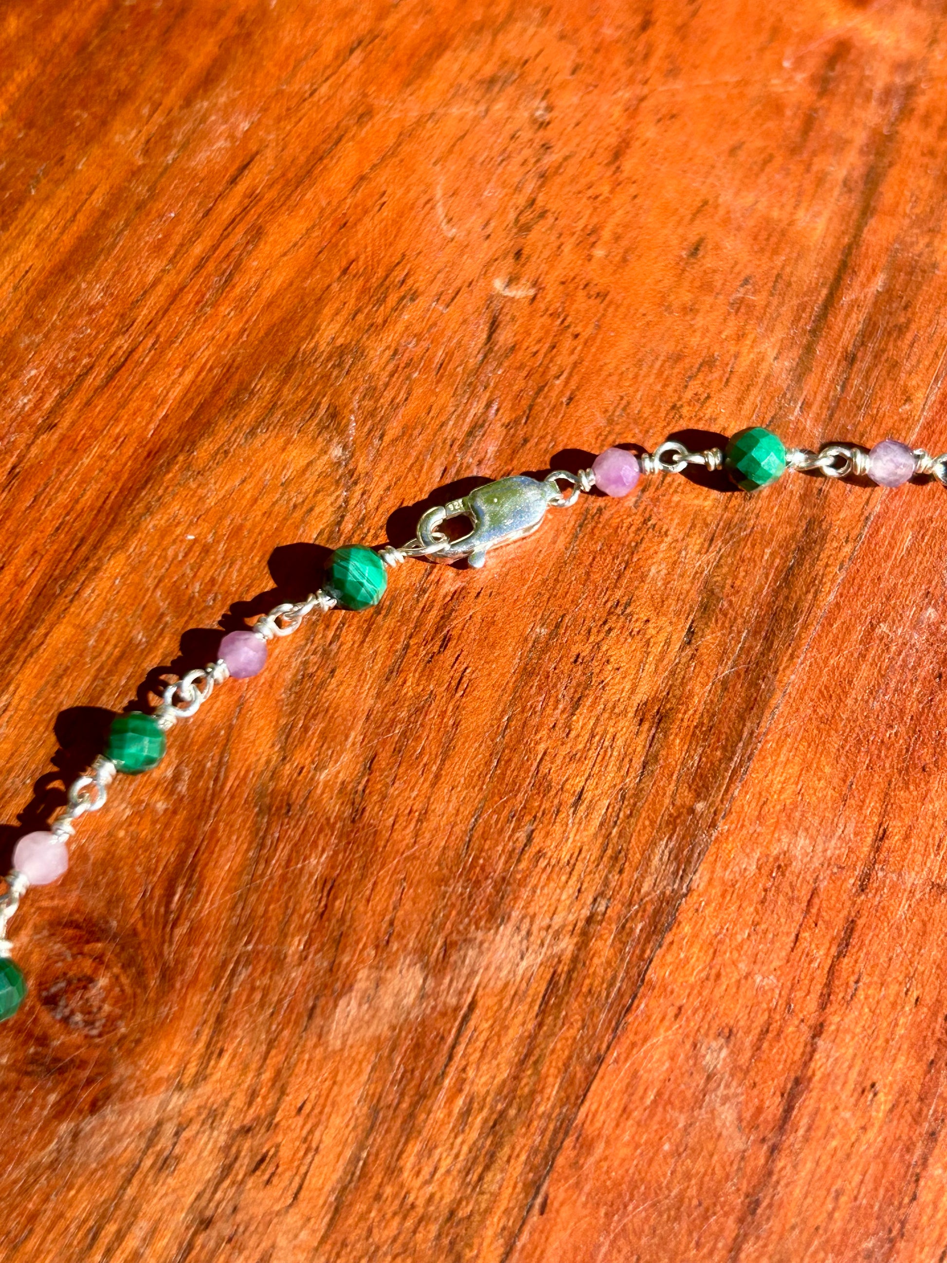 Chain link necklace made with monstera leaf sterling silver pendant and Malachite & Lepidolite faceted gemstone beads