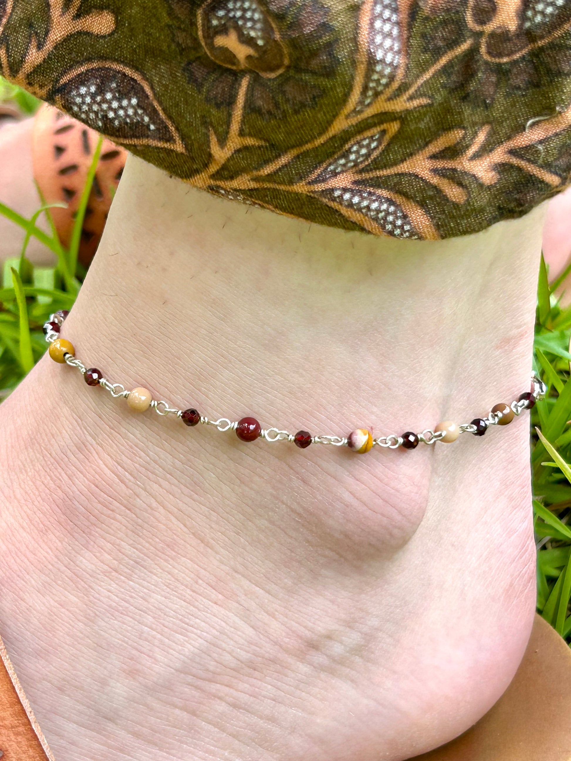 Chain link anklet made with round Mookaite Jasper and faceted round Garnet gemstone beads