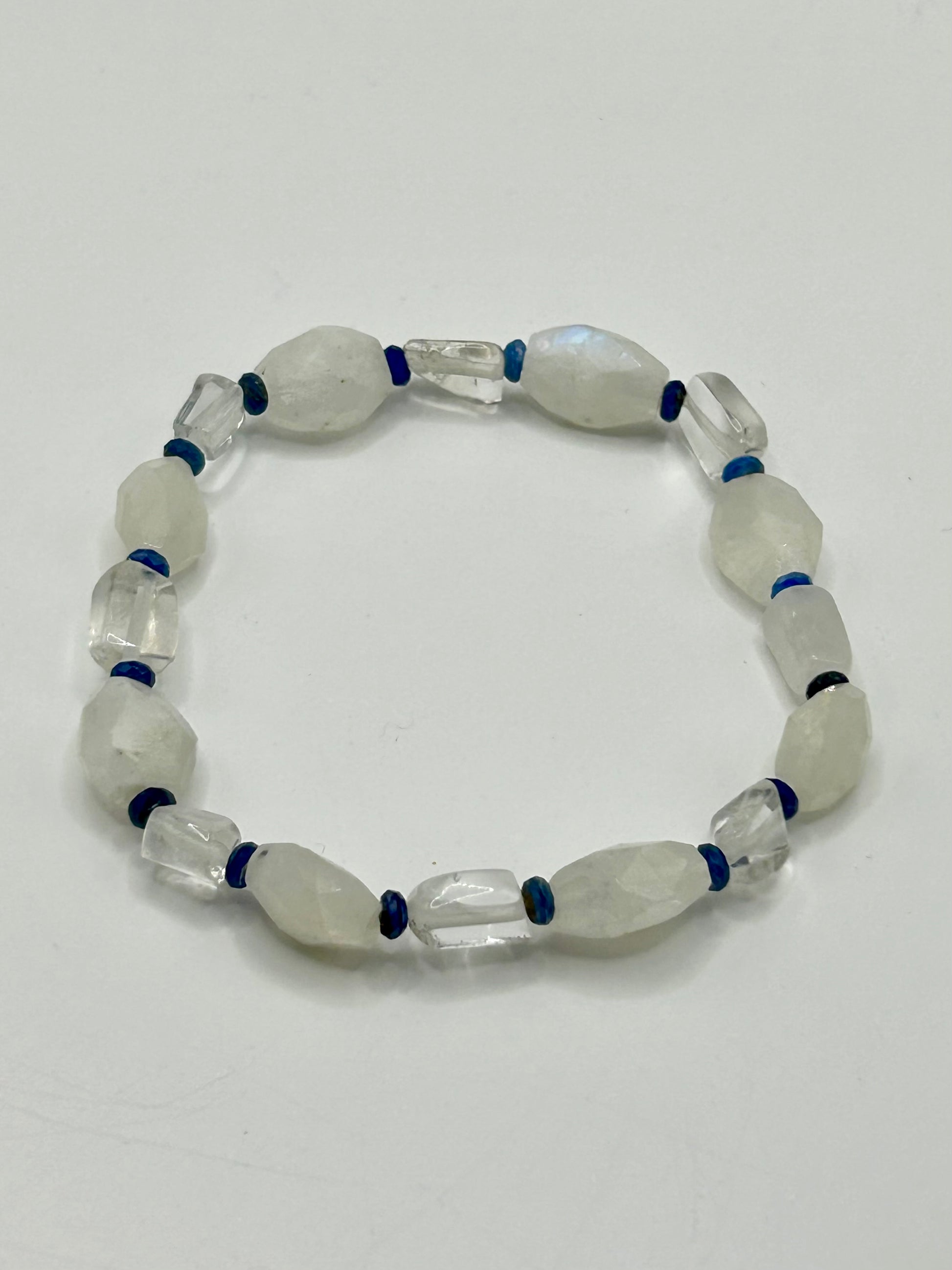 Beaded bracelet on elastic cord with geometric Rainbow Moonstones, freeform Clear Quartz, and tint faceted Blue Kyanite rondelle gemstones