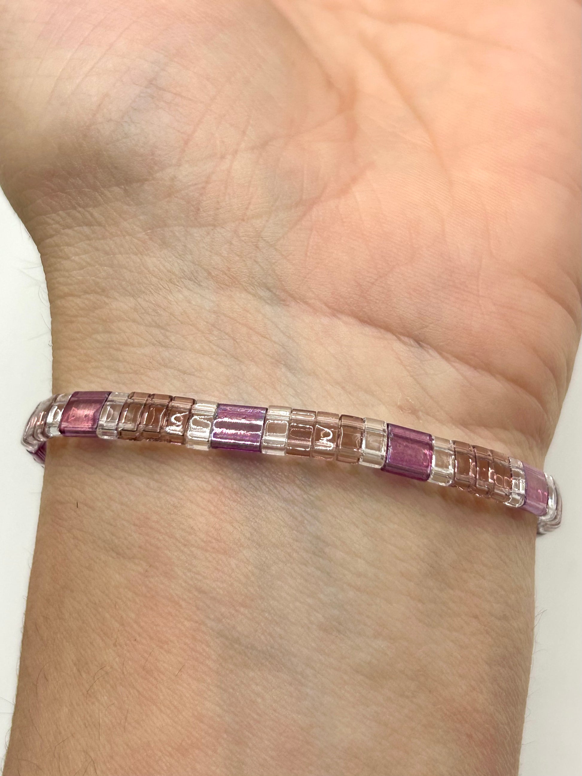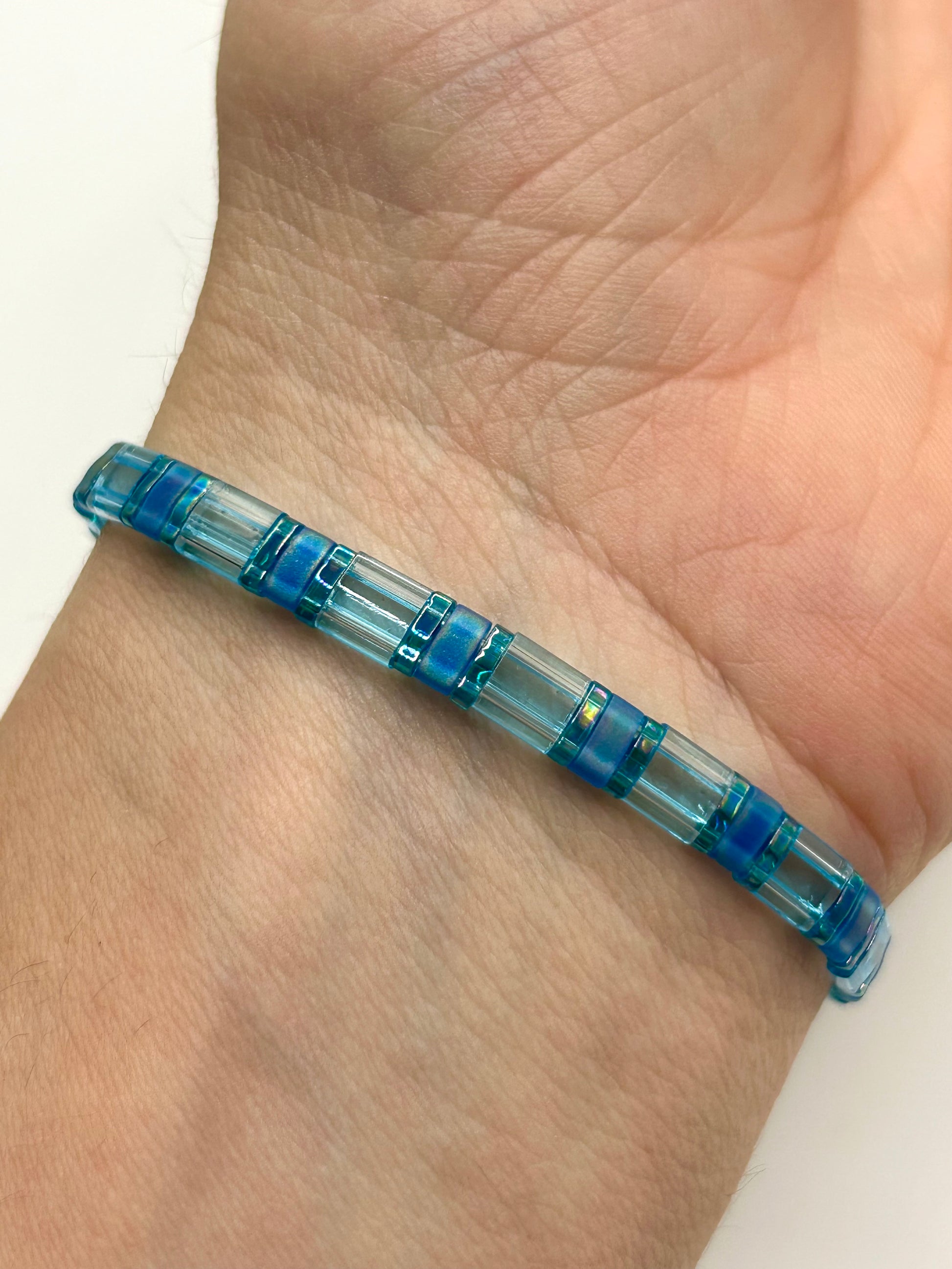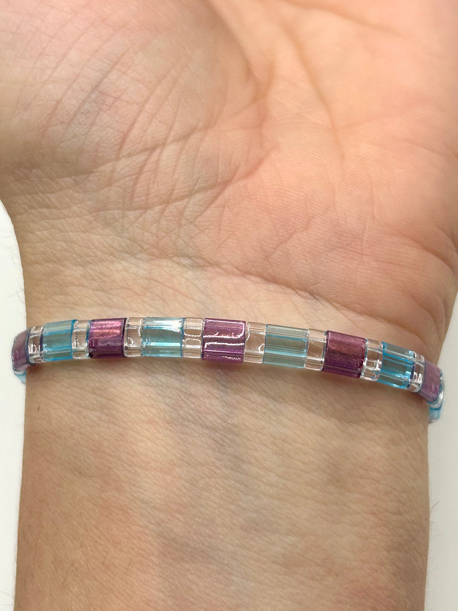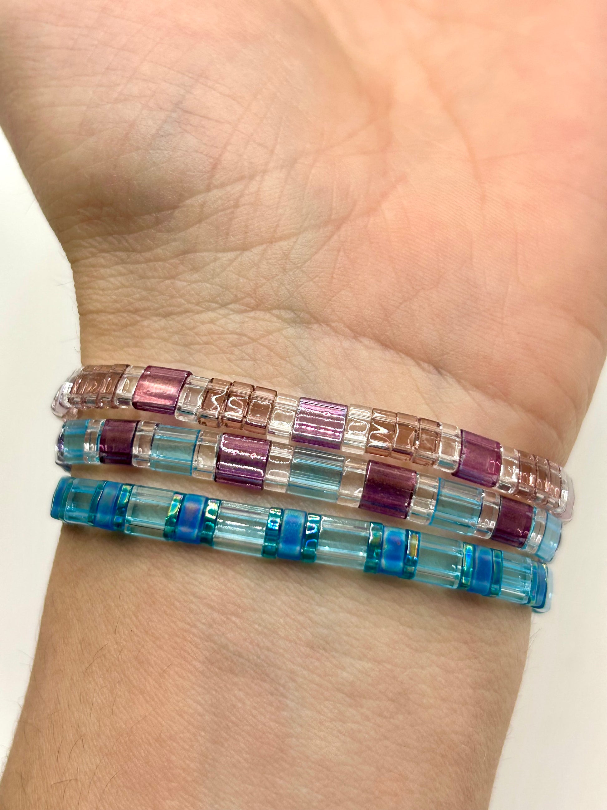 Inspired by sea glass and shifting moonlight, these translucent-toned bracelets shimmer in shades of purple, aqua, and deep blue. Crafted with premium Miyuki TILA beads and double elastic, they’re lightweight, stretchy, and perfect for stacking or wearing solo.