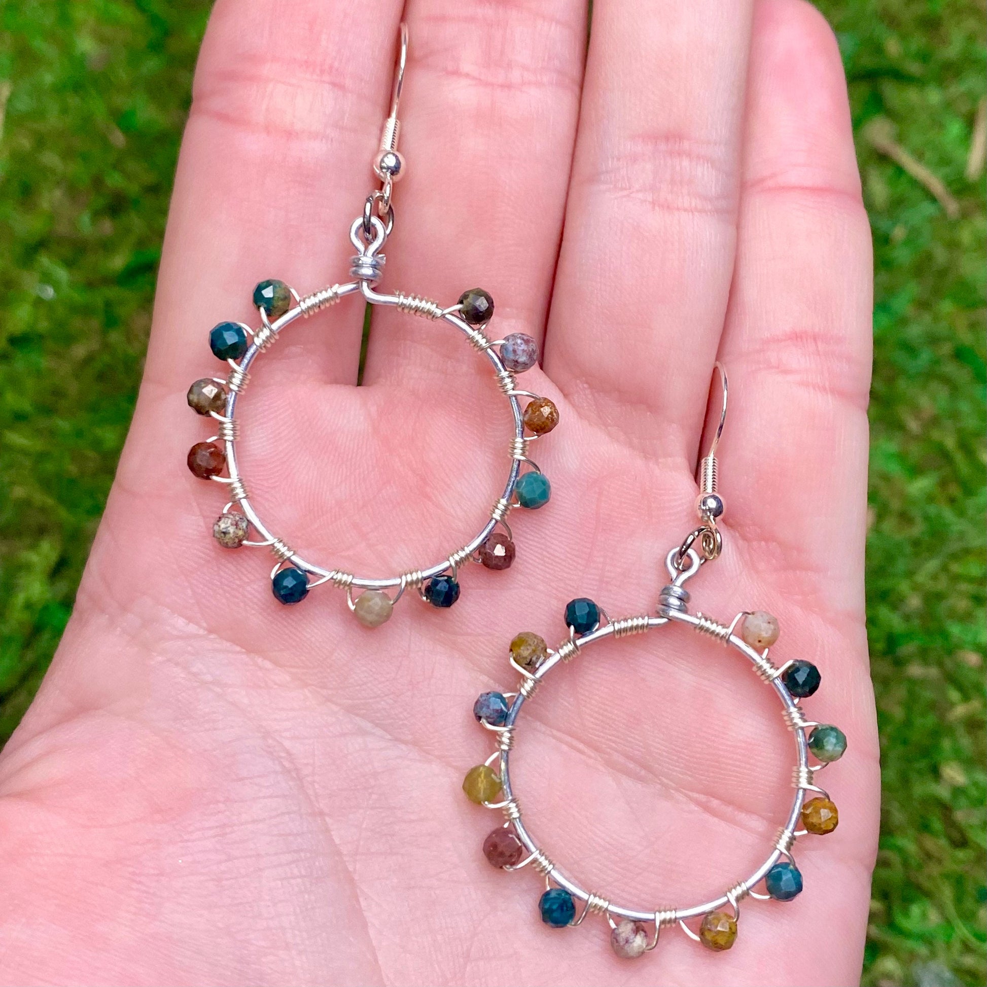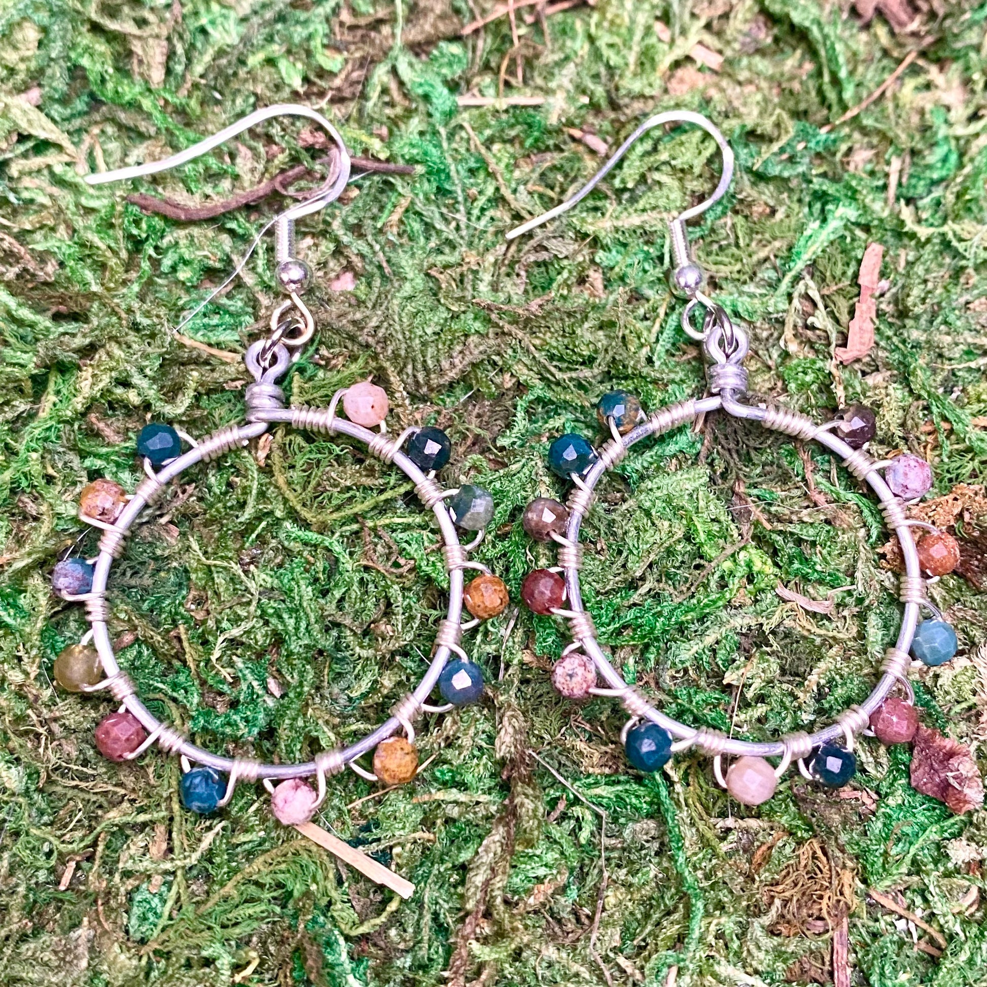 Dangly wire wrapped hoop earrings with ocean jasper gemstone beads