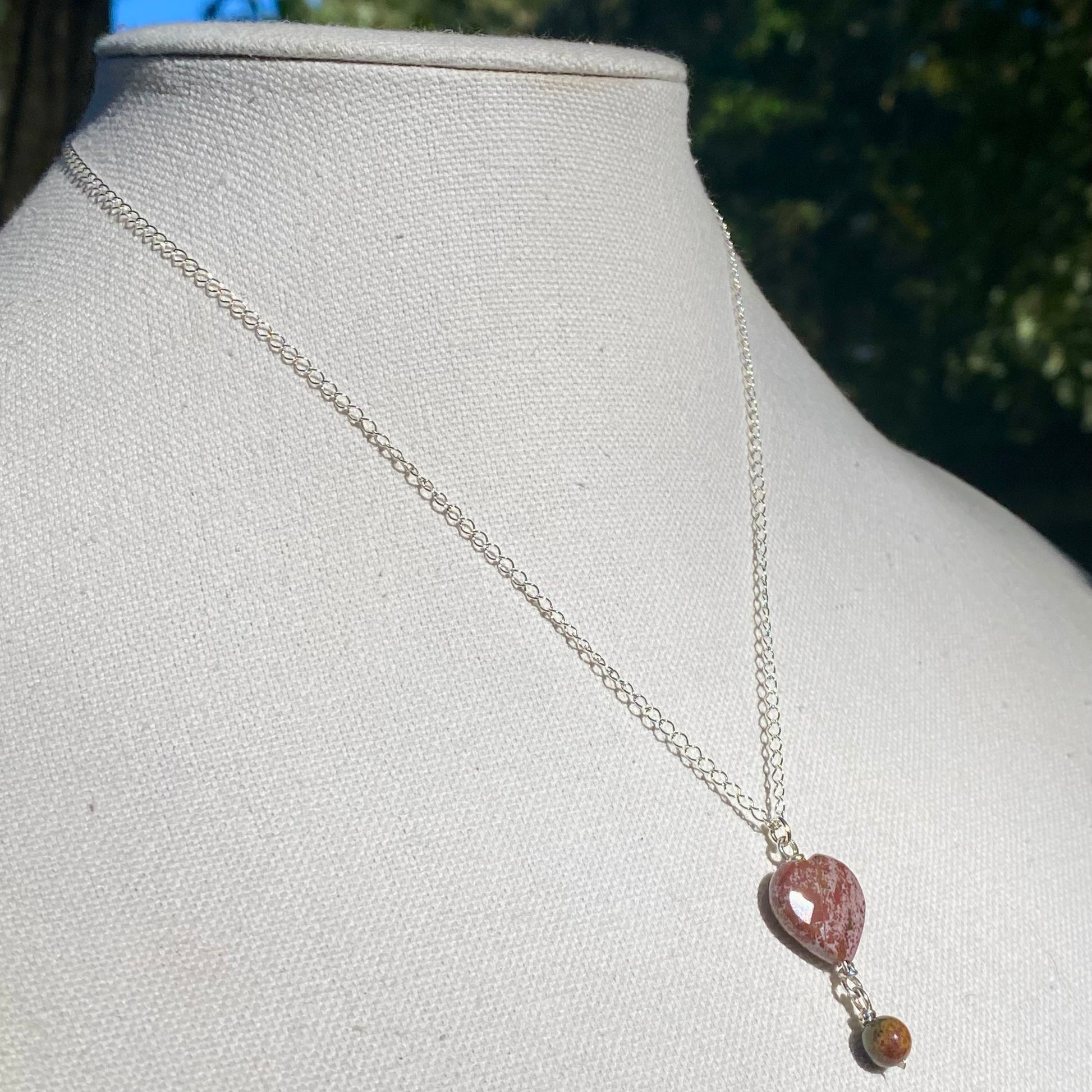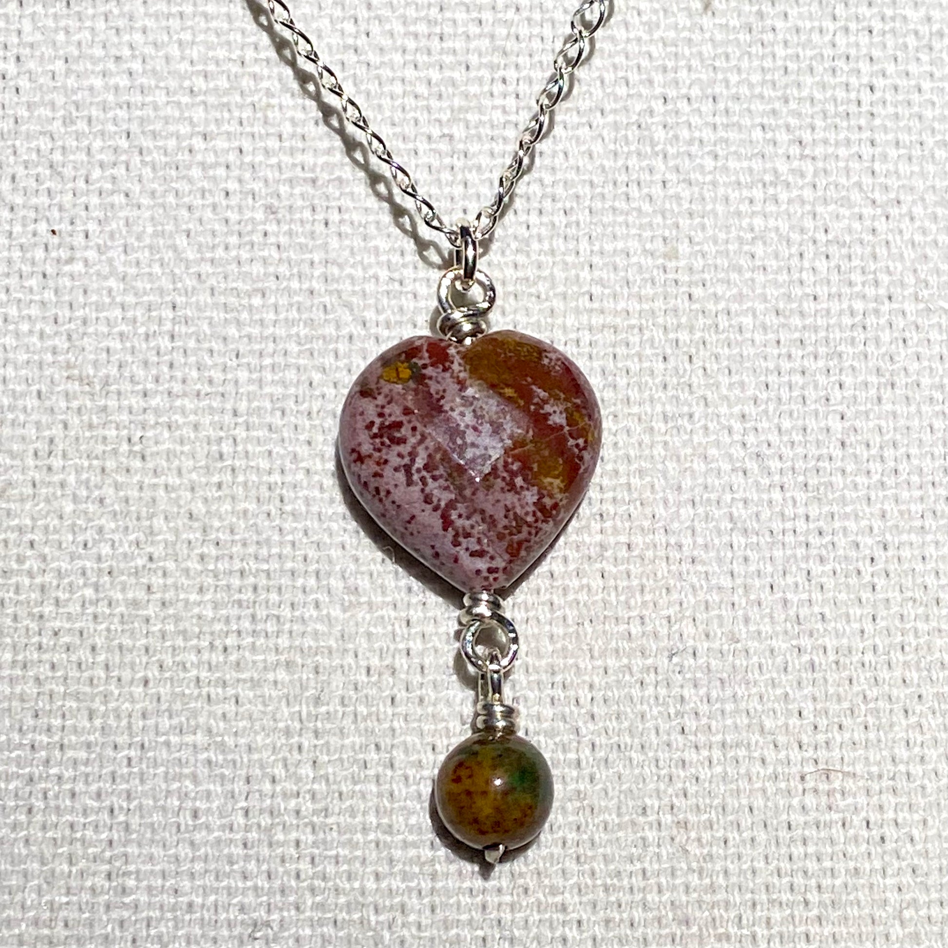 18” sterling silver chain with ocean jasper faceted heart & round bead pendant