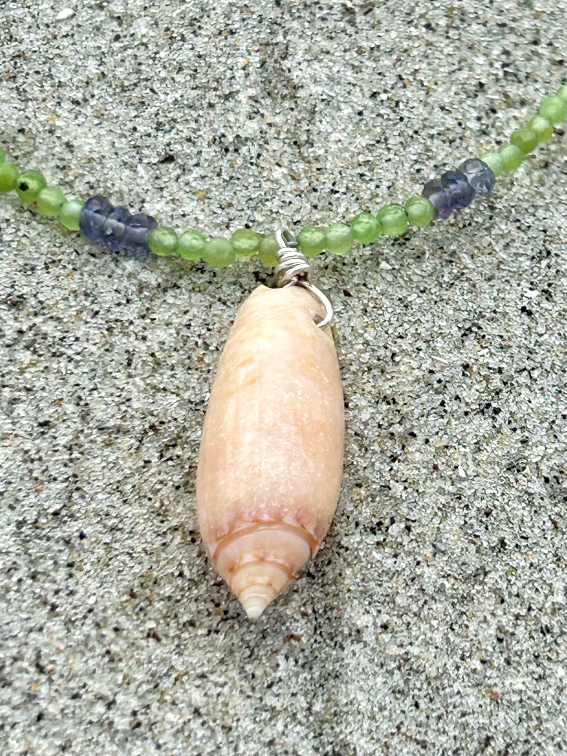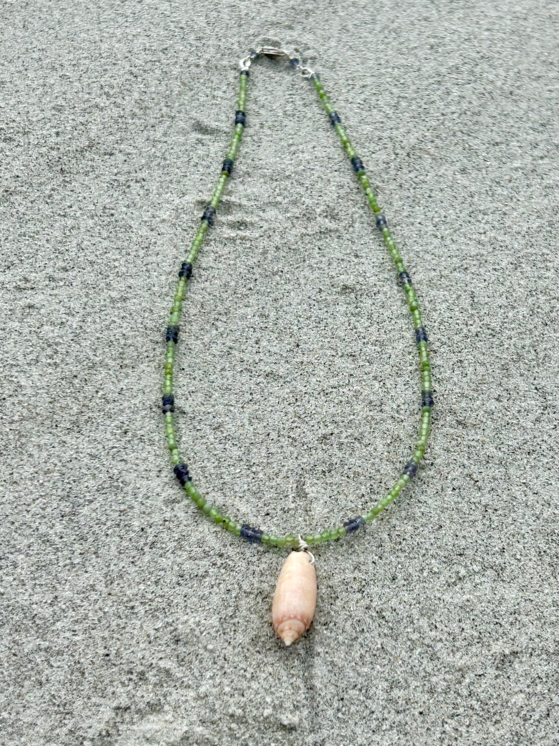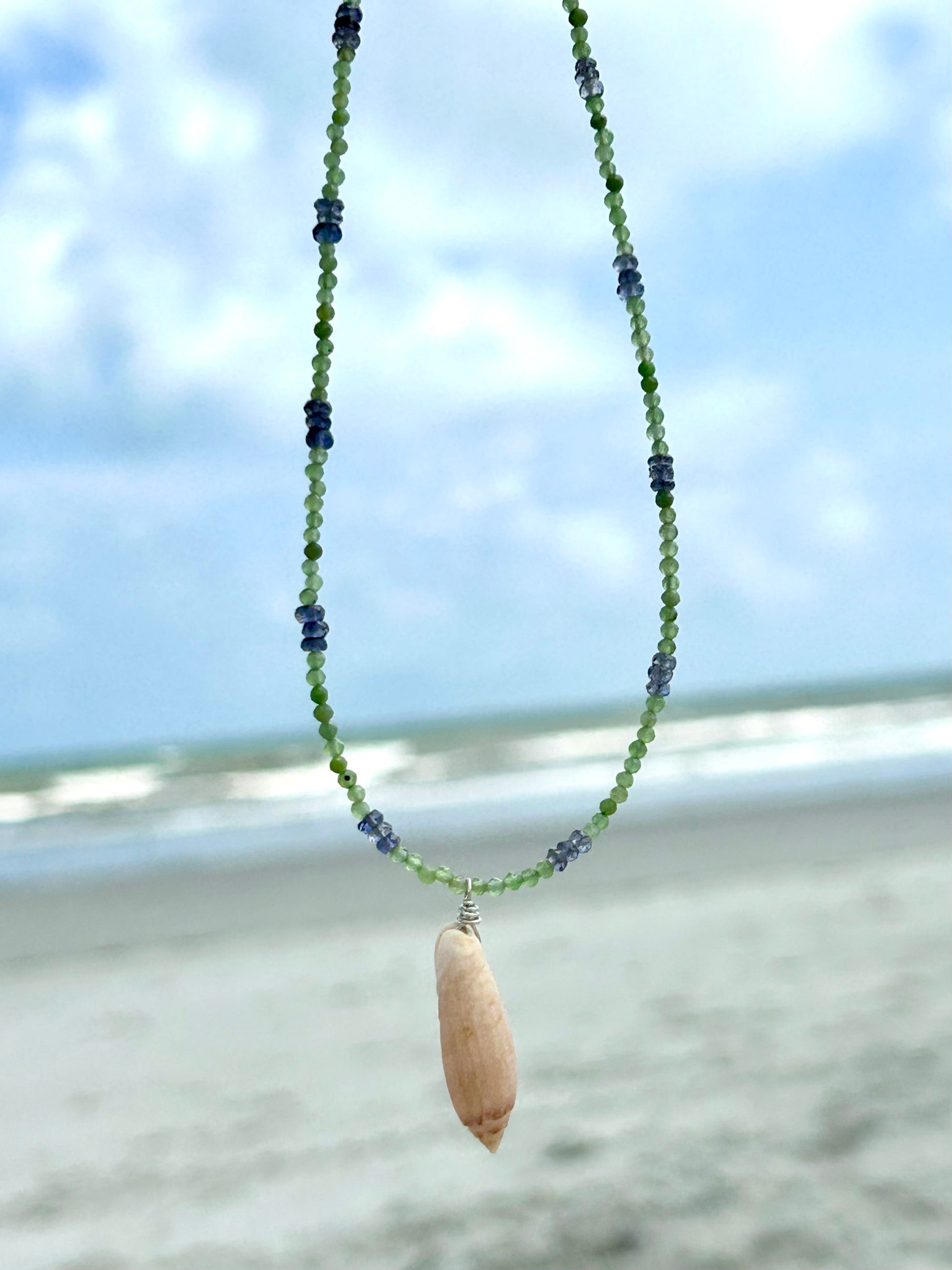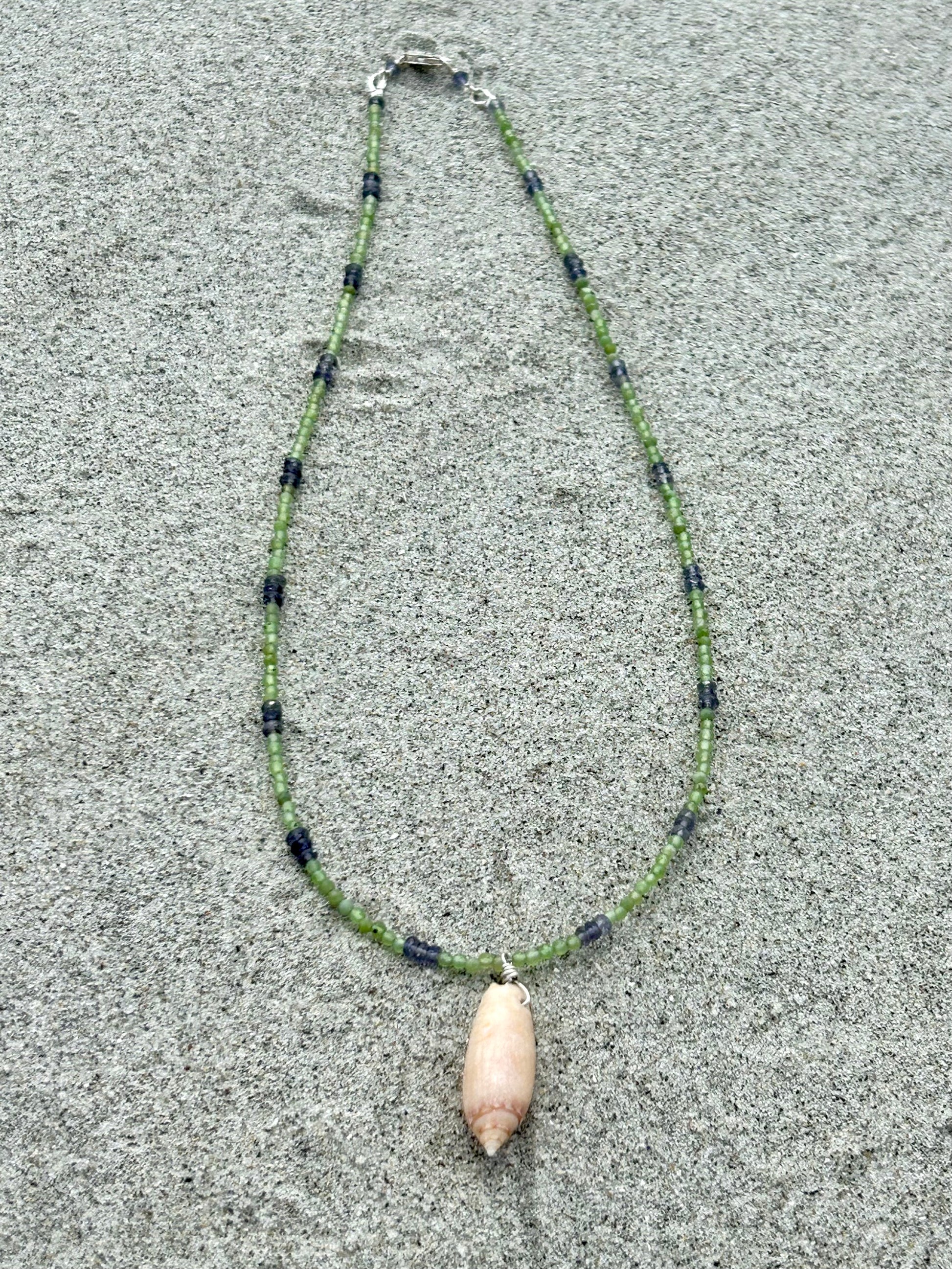 Beaded necklace with hand drilled Olive Shell found on the SC coast and Nephrite Jade & Iolite faceted gemstone beads
