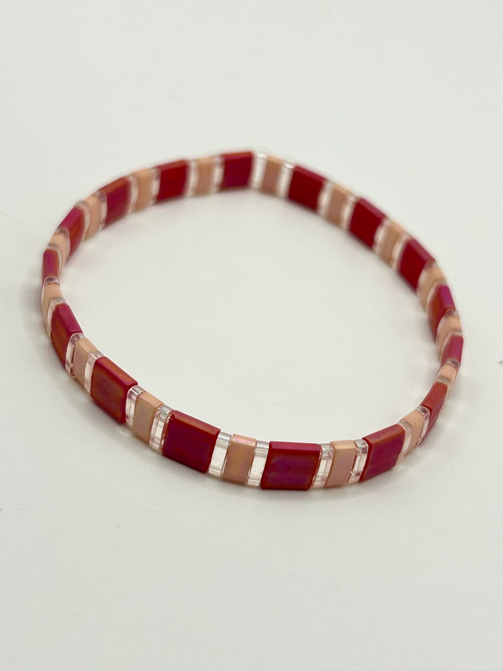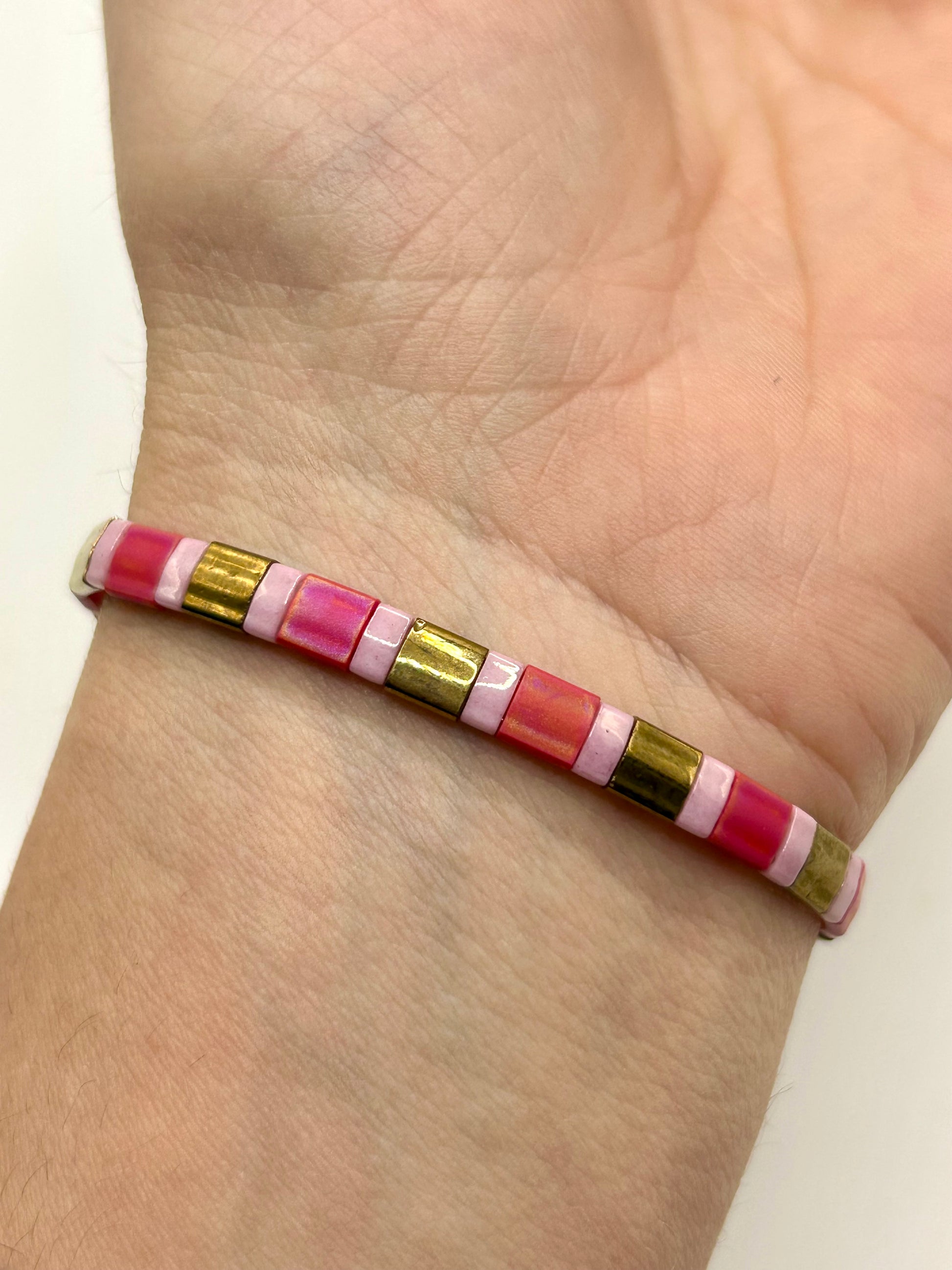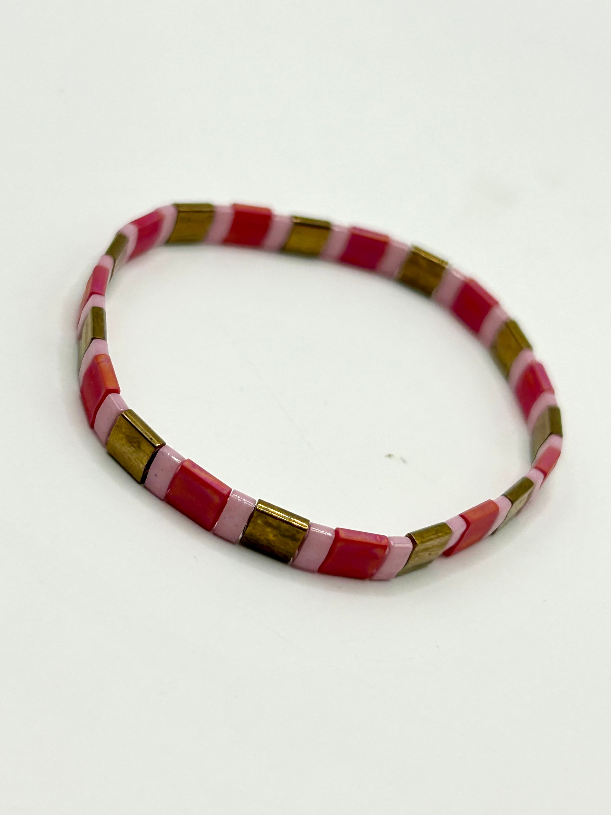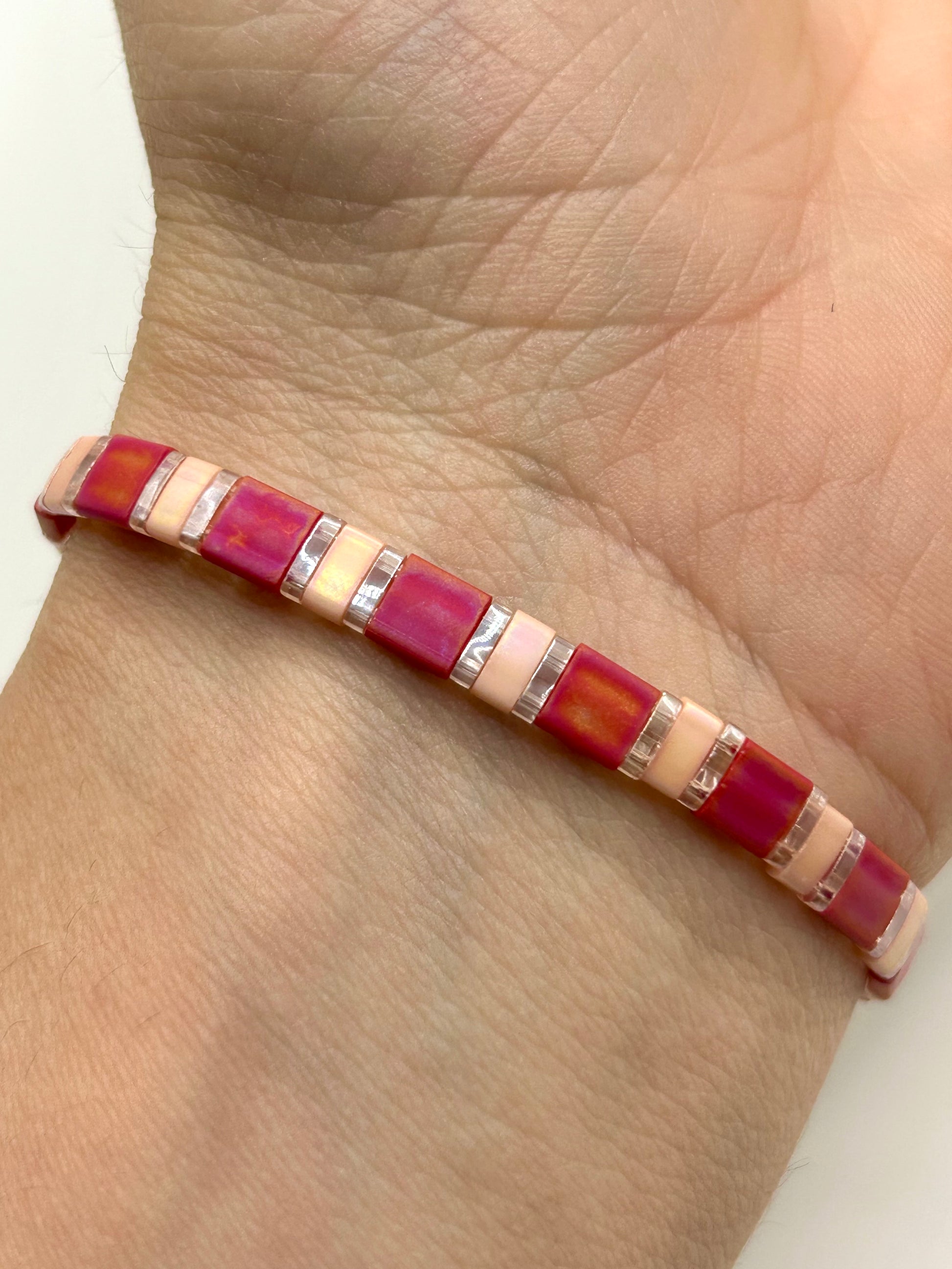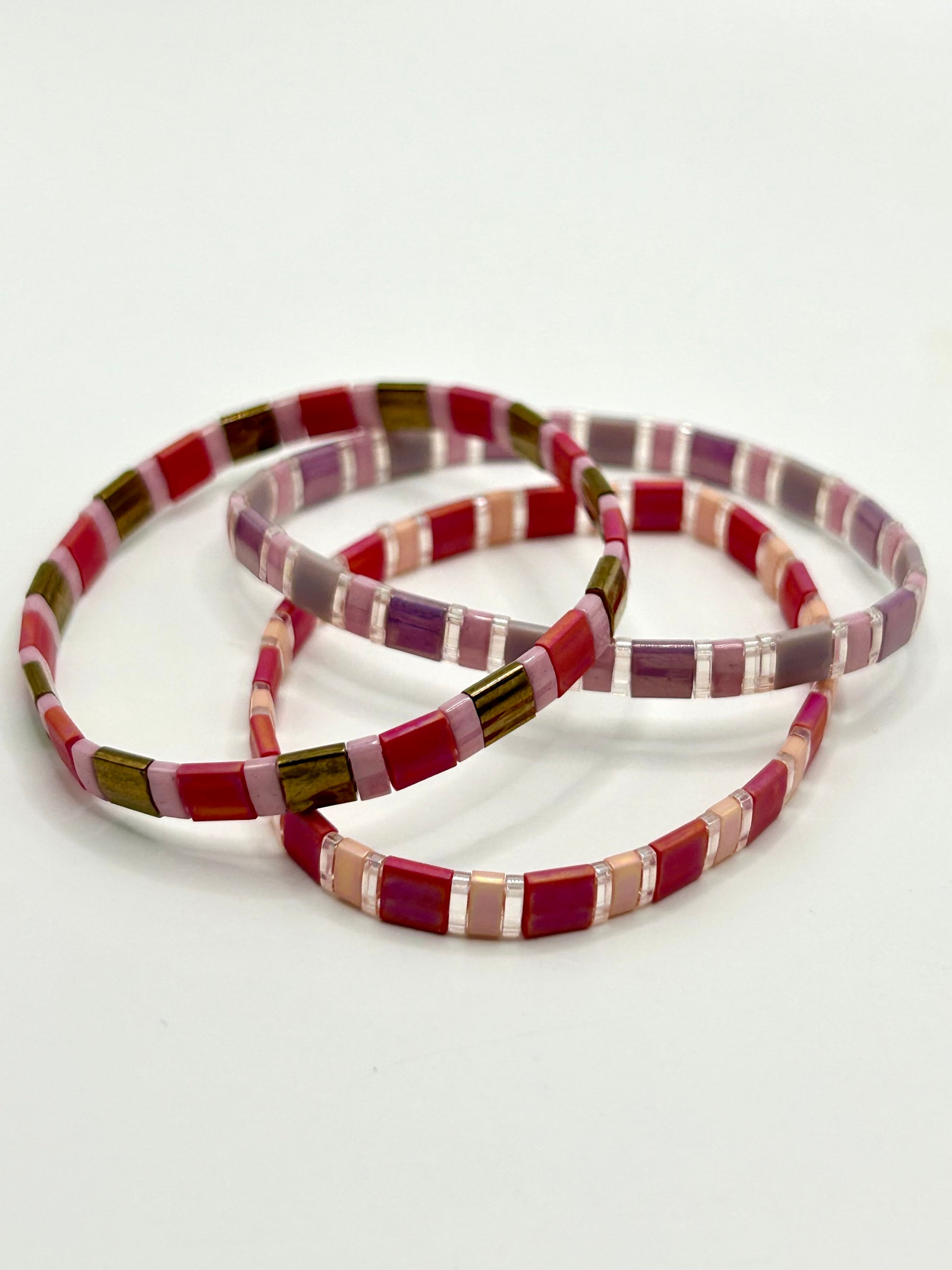 Raspberry Bloom Tila Glass Bead Elastic Bracelet Collection