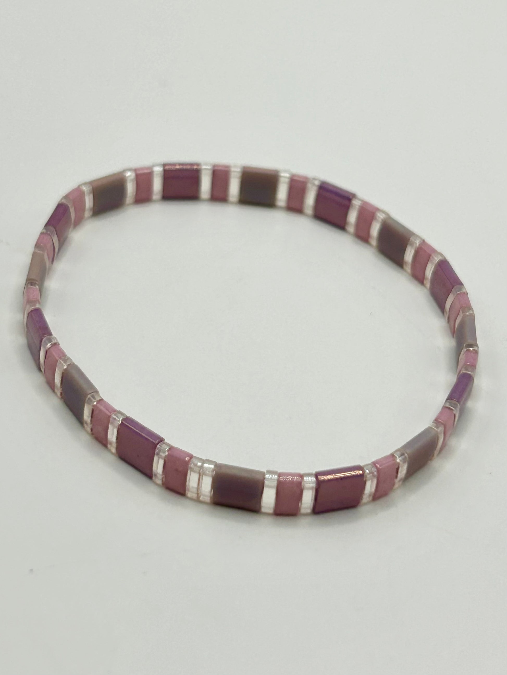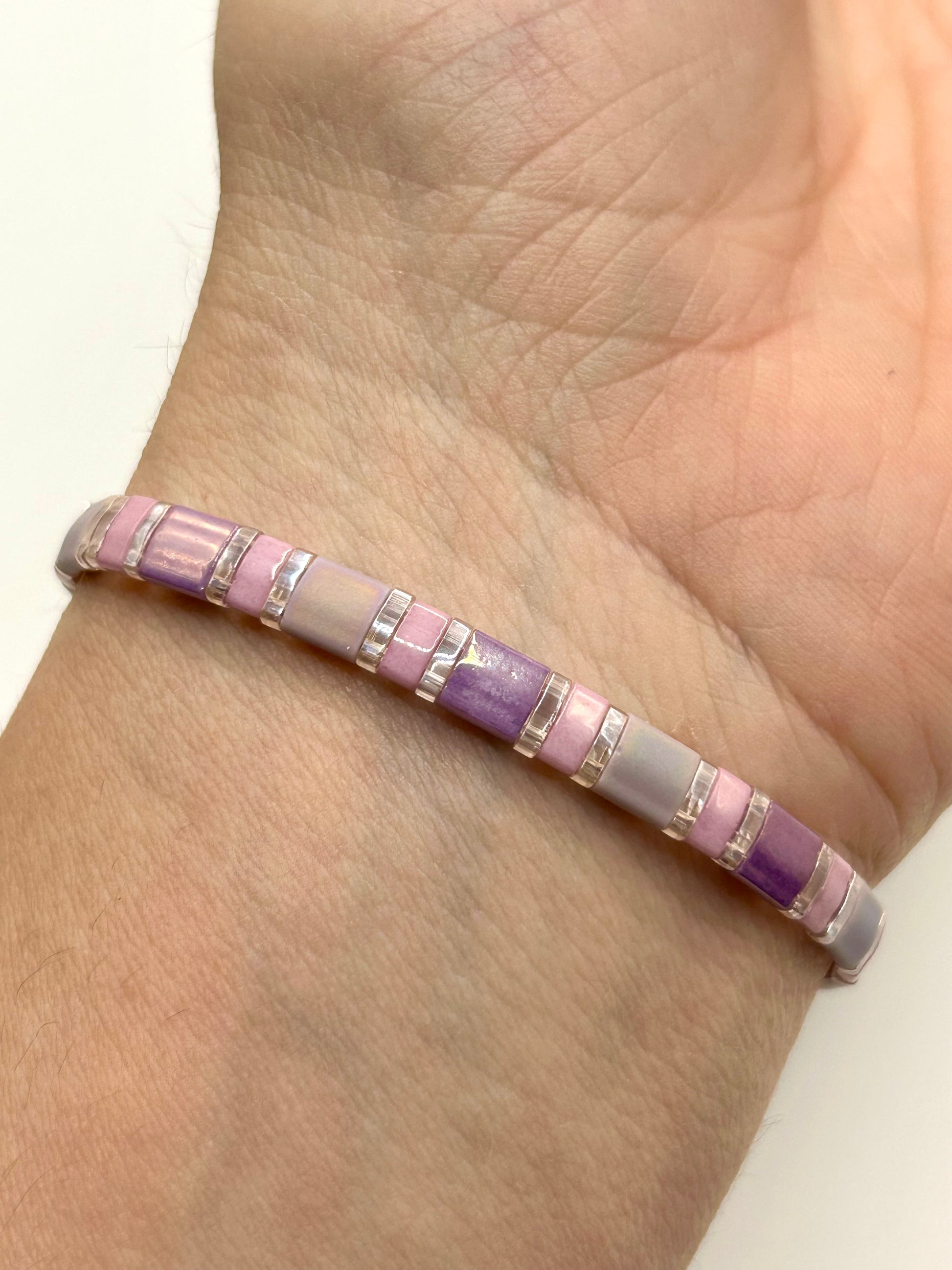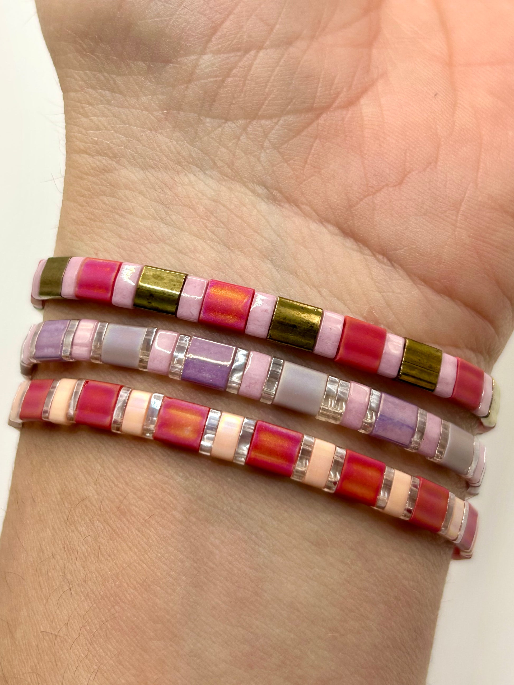 Playful and romantic, this collection blends raspberry, blush, and soft lilac tones for a sweet yet sophisticated pop of color. Each bracelet is made to order with Miyuki Japanese glass beads on a strong, stretchy double-stranded elastic.