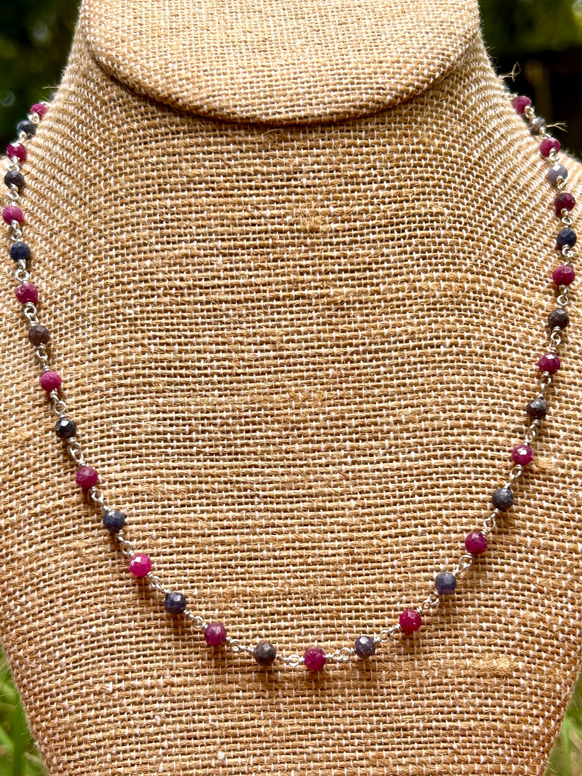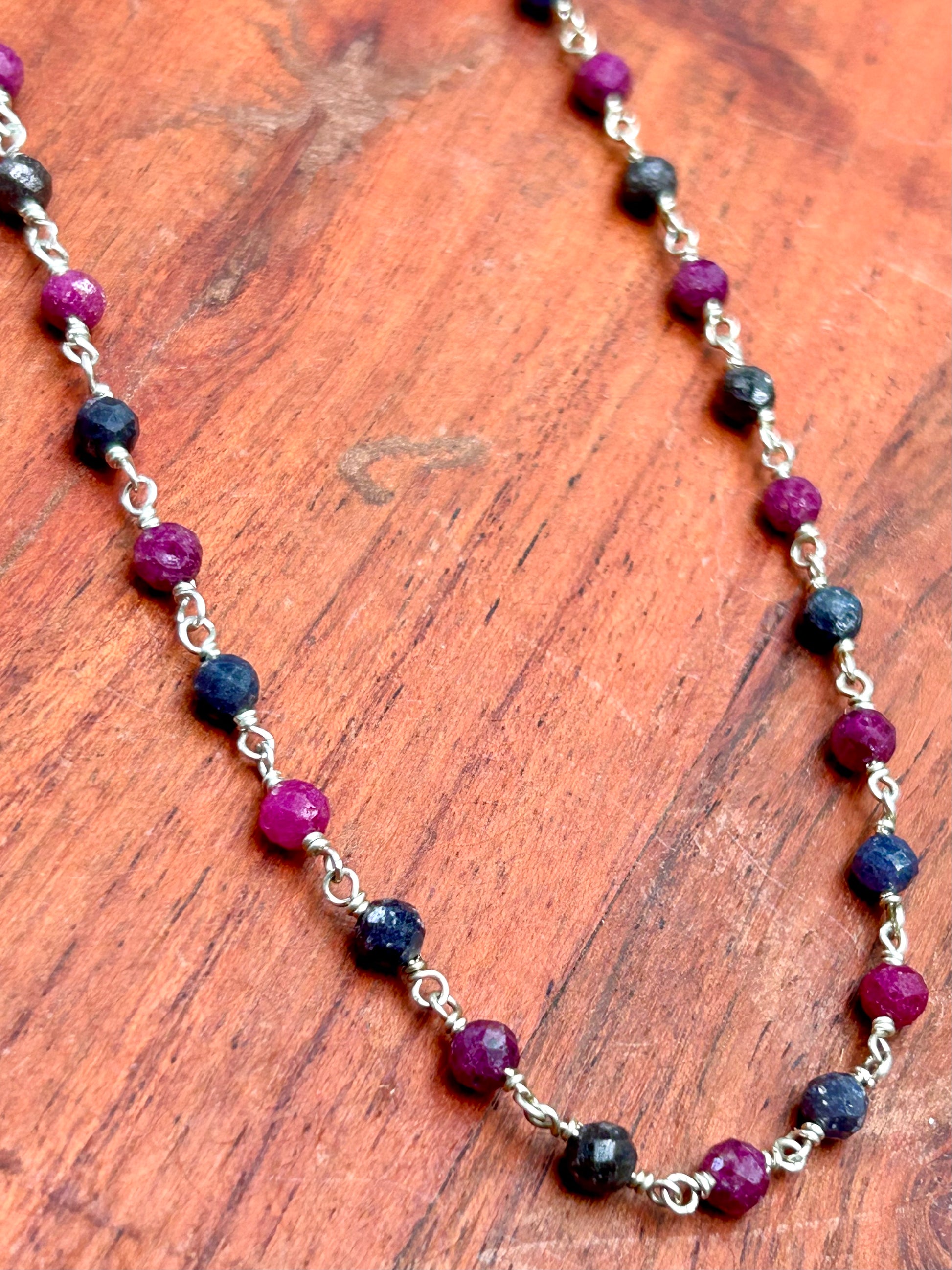 Chain link necklace made with genuine Ruby & Sapphire faceted gemstone beads