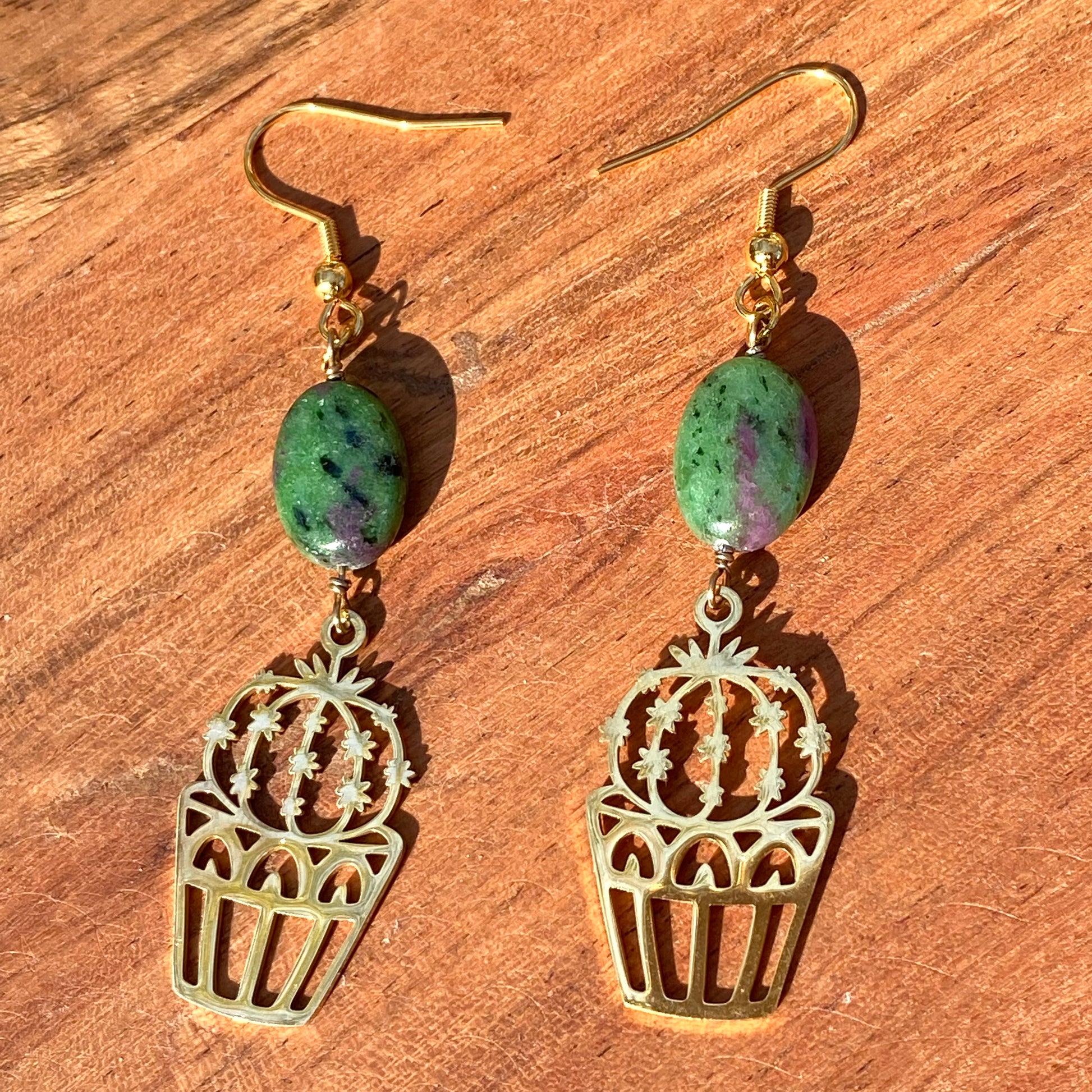 Dangly earrings with ruby zoisite gemstones and cactus charm