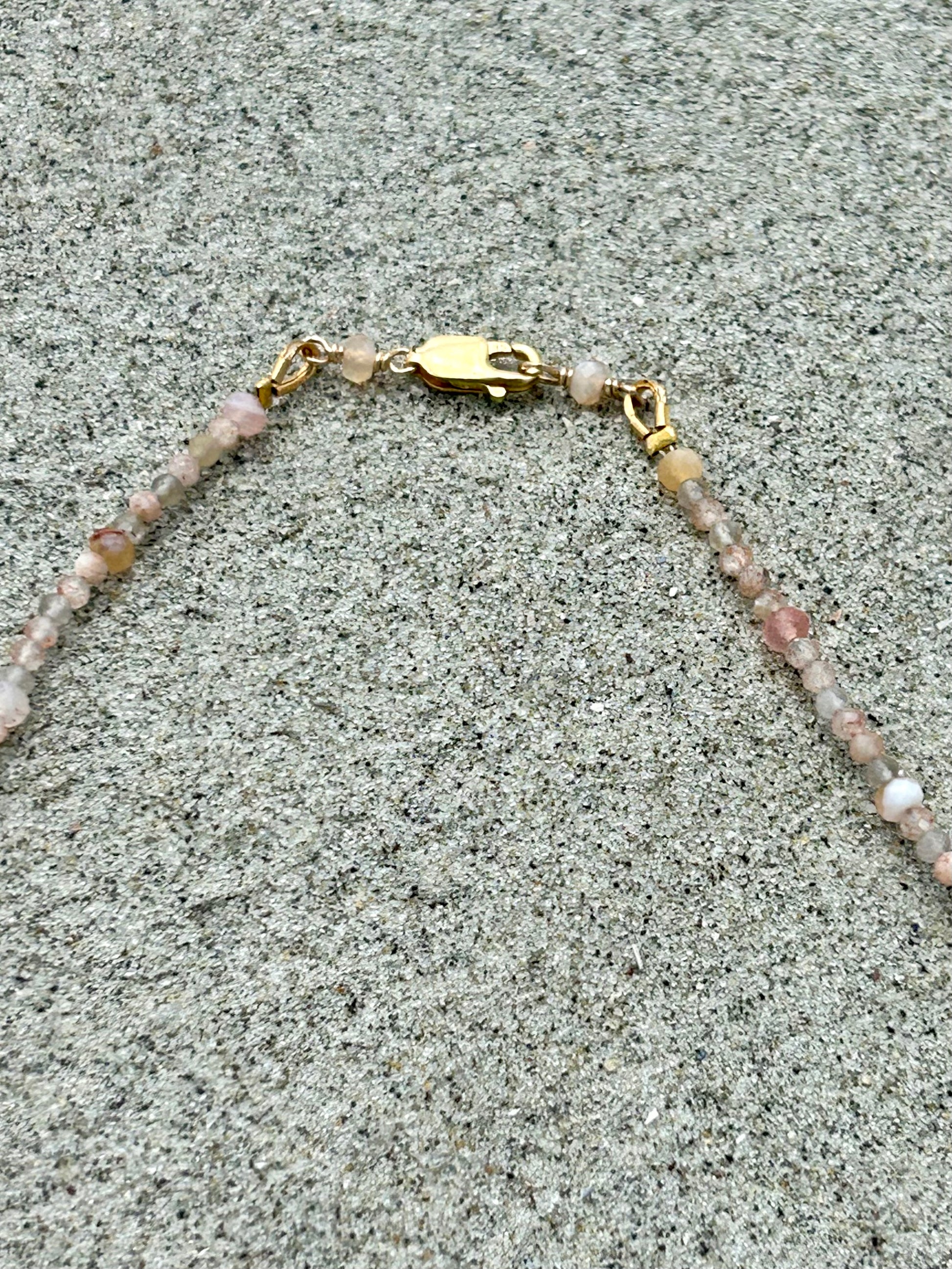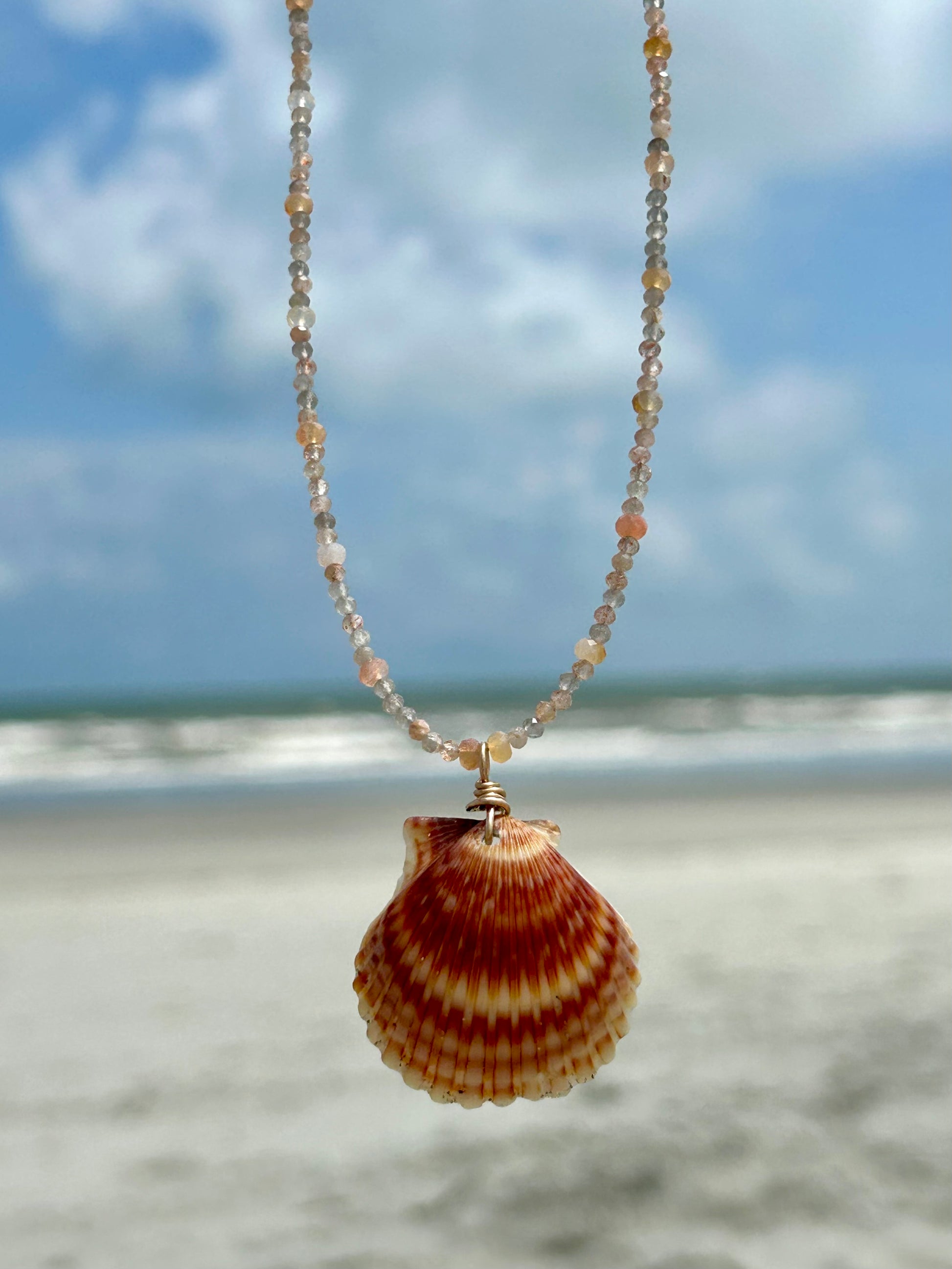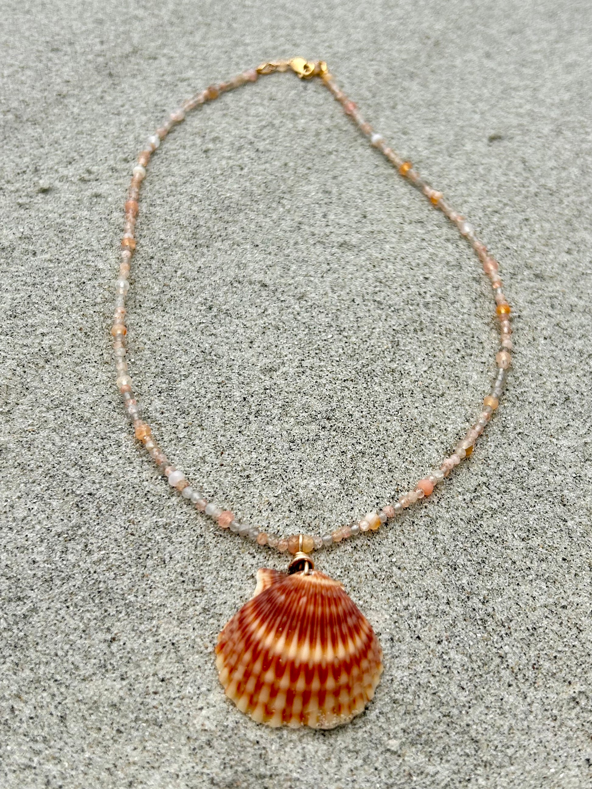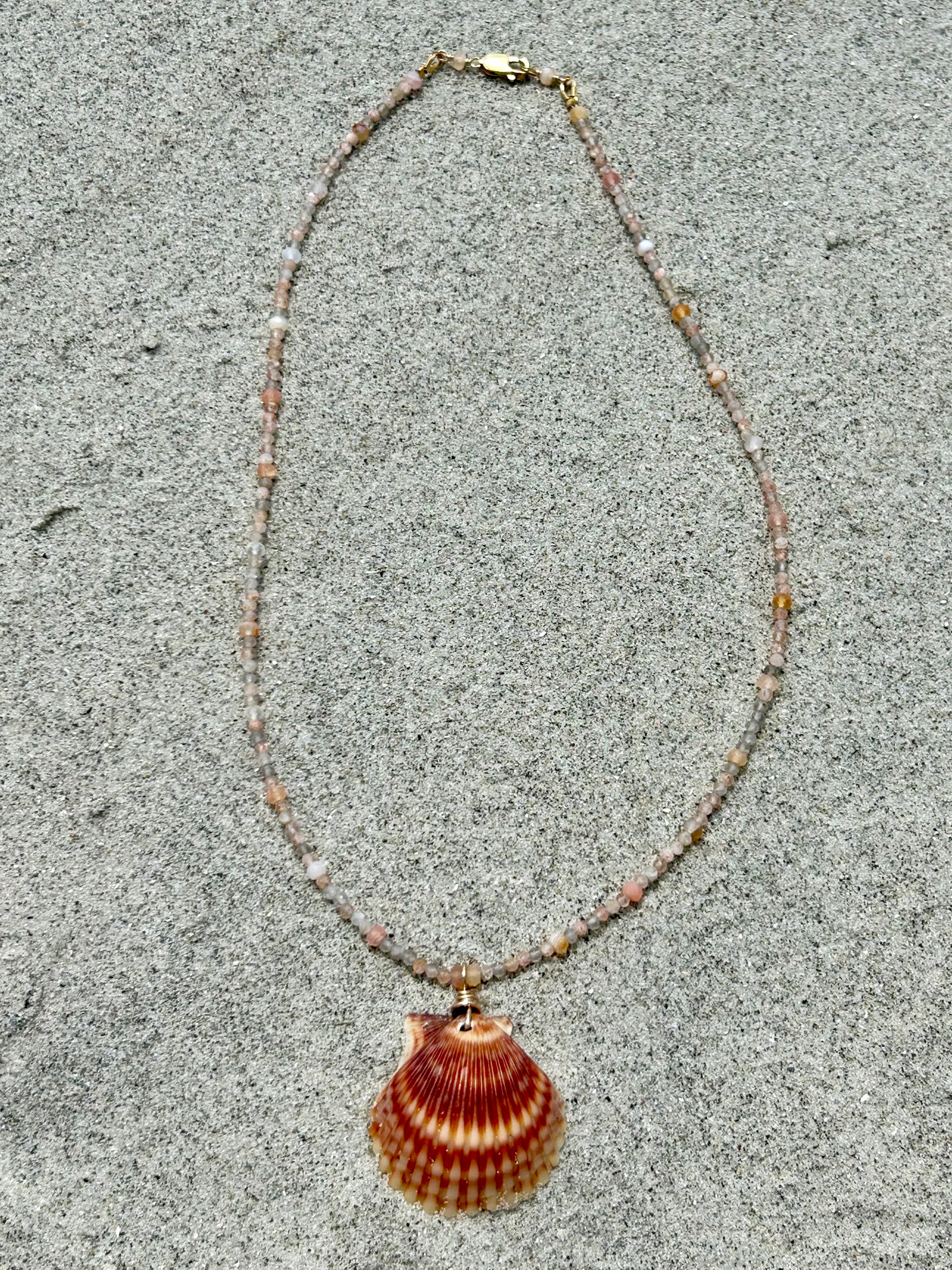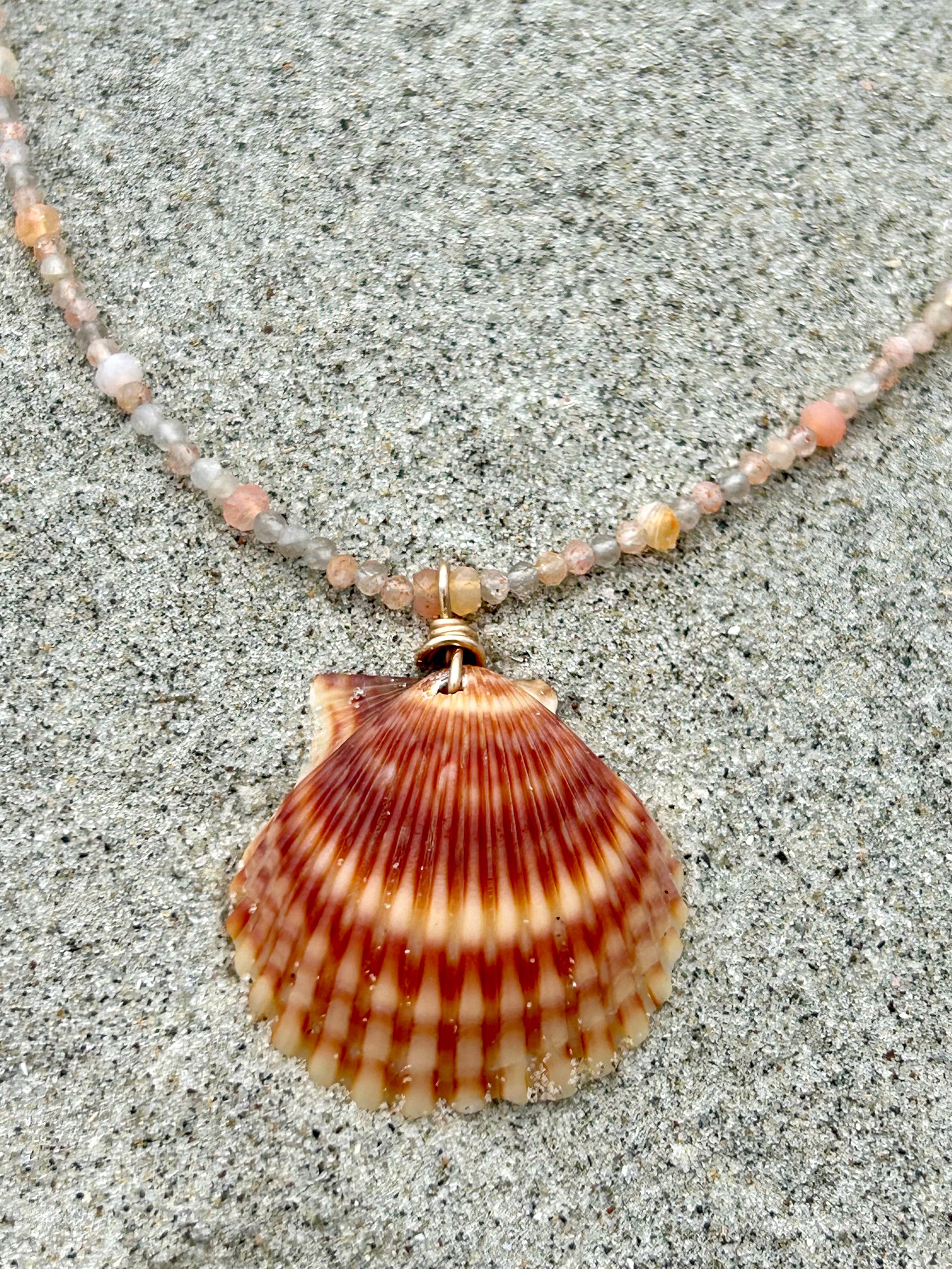 Beaded necklace with Scallop shell pendant and mini faceted Moonstone & Botswana Agate gemstone beads
