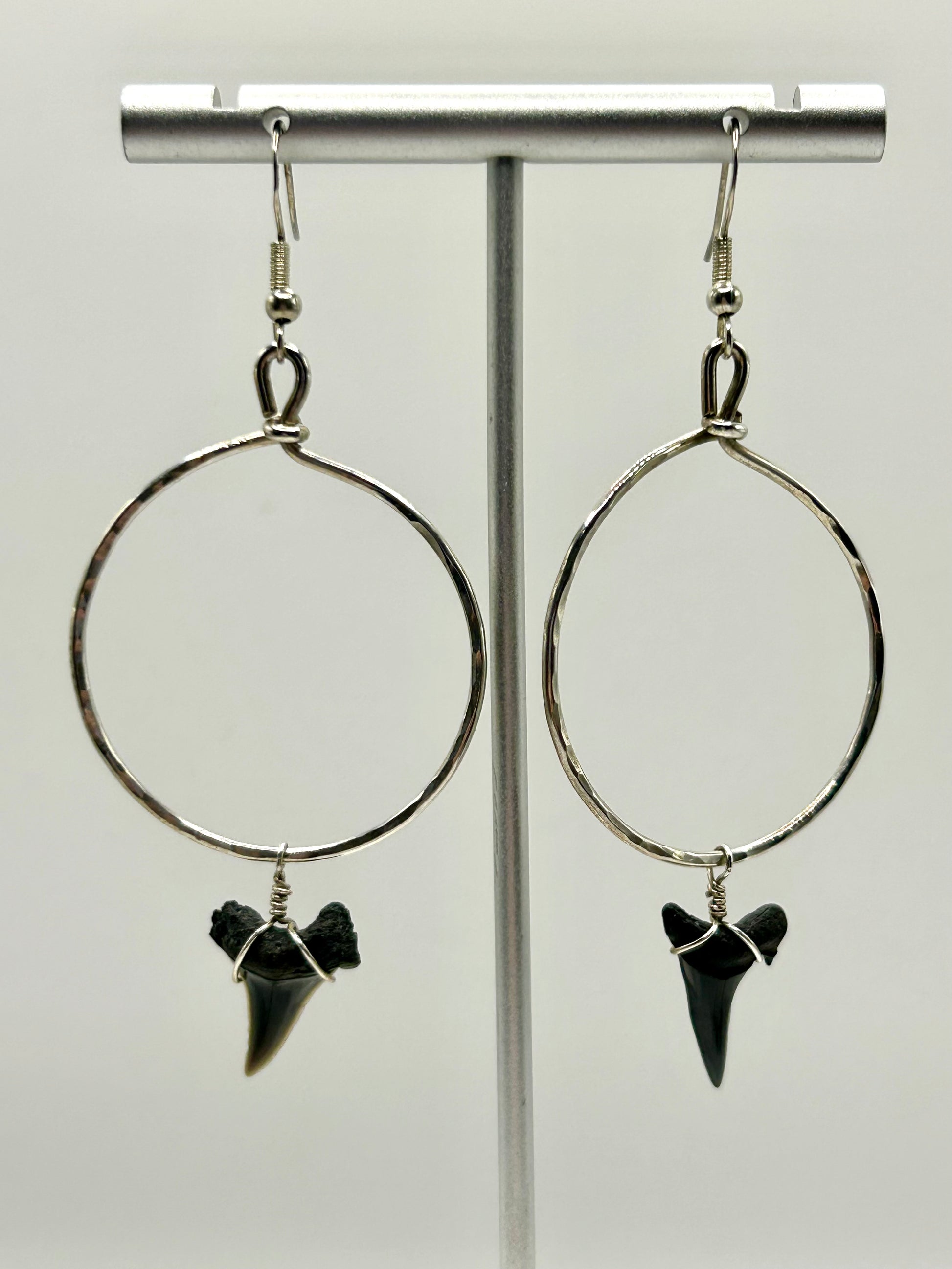 REAL SHARK TEETH FOSSILS found on the South Carolina coast, wire wrapped dangling from large silver hoops