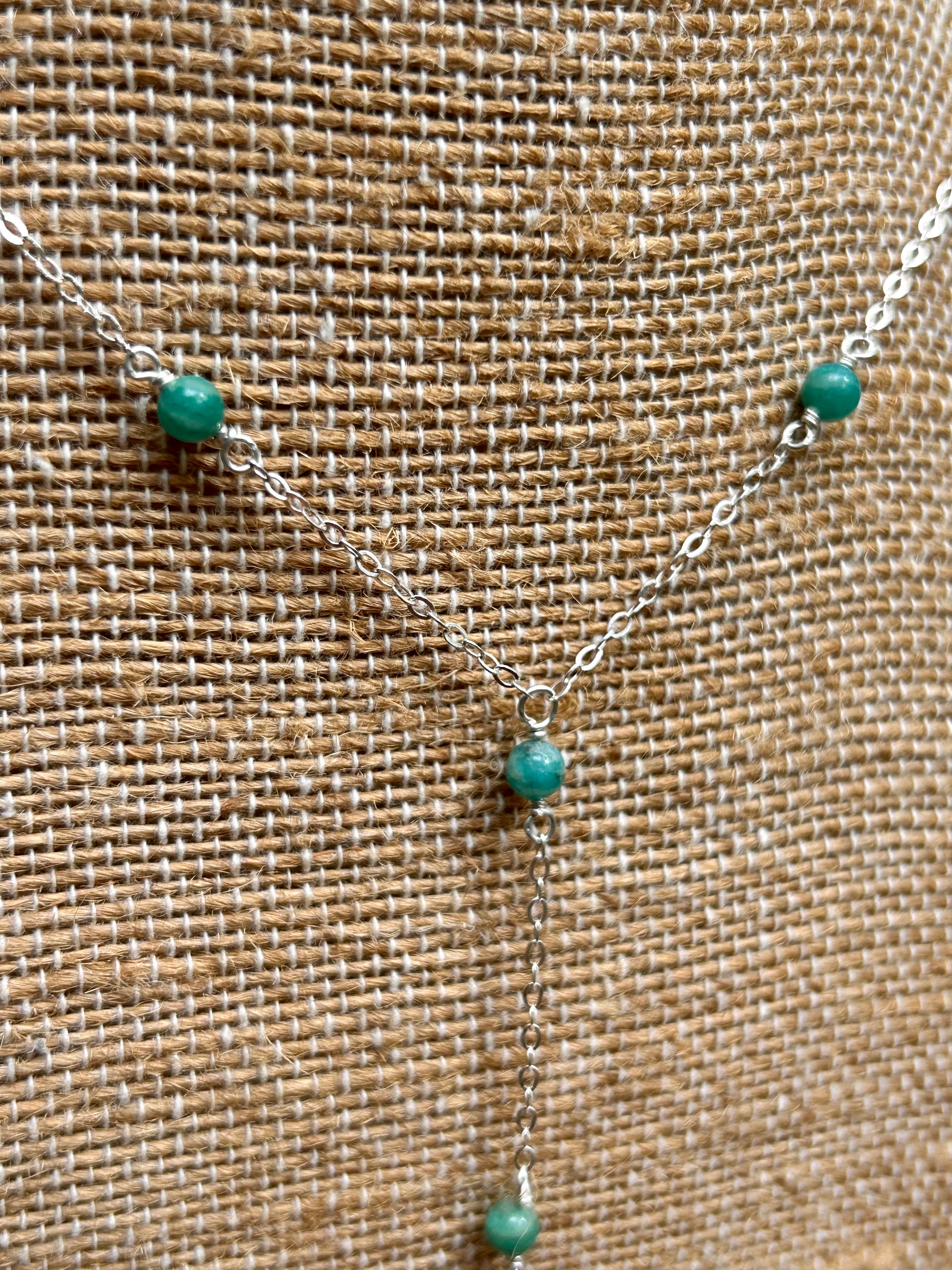 Sterling silver satellite chain lariat necklace with round Amazonite gemstone beads and wire wrapped genuine shark tooth fossil found in Charleston, SC