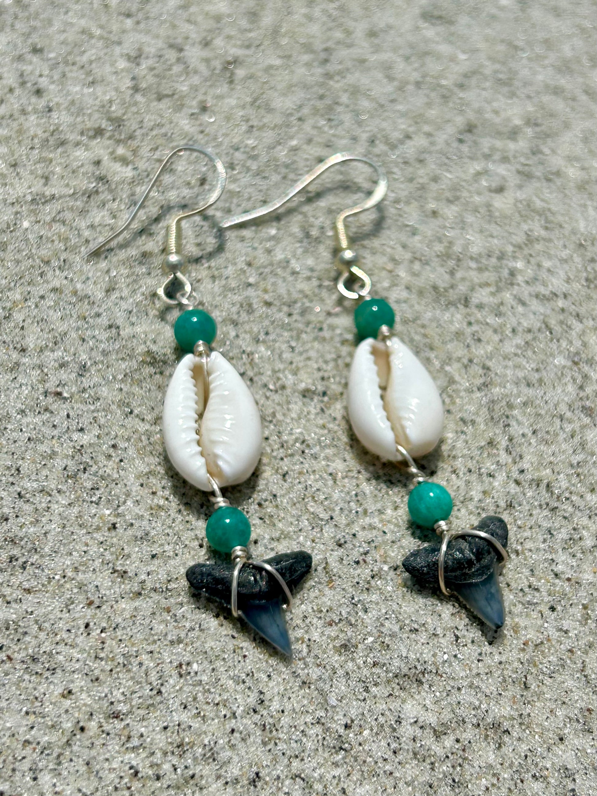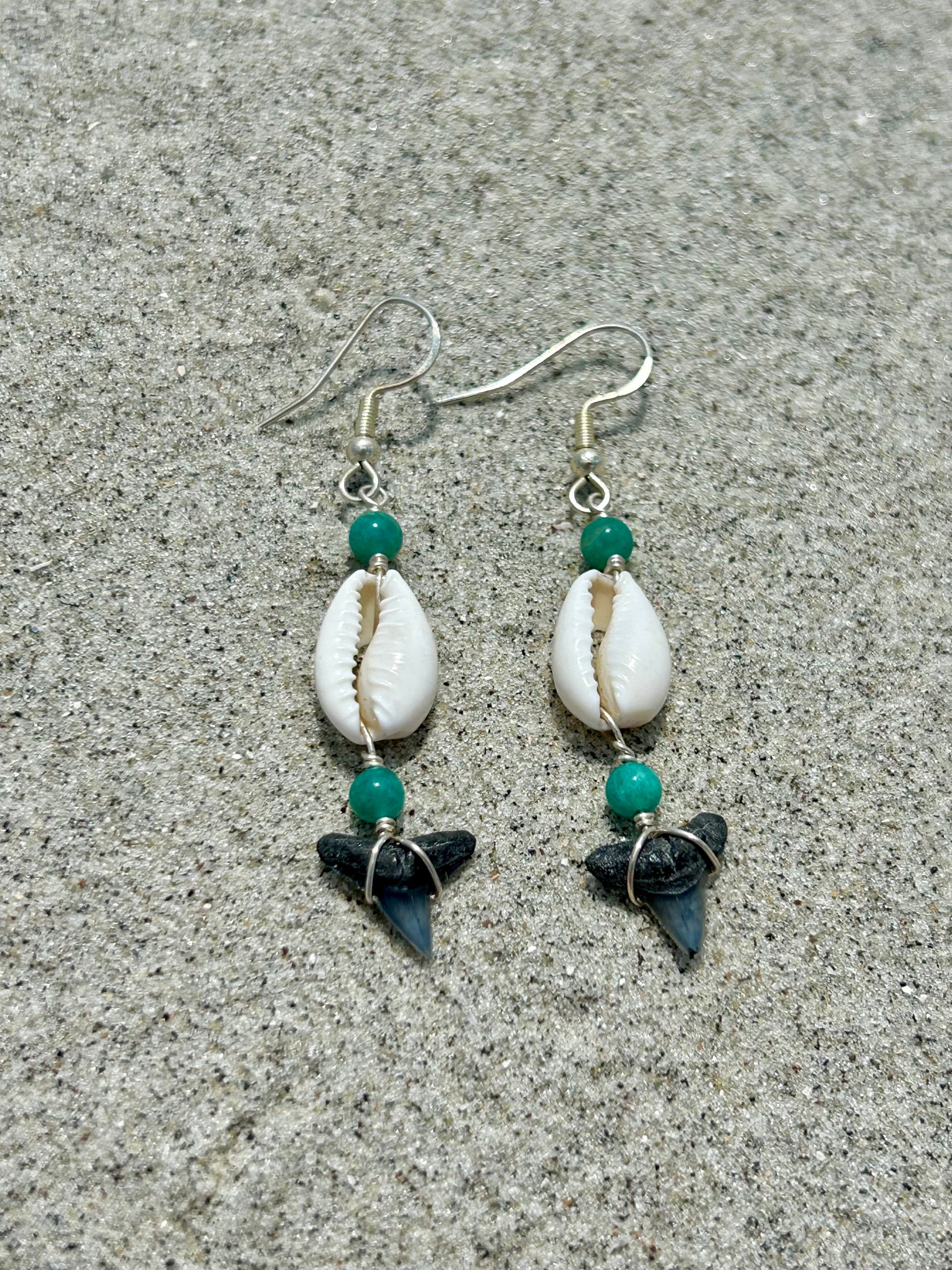 Shark Tooth Fossil with Cowrie Shell & Amazonite Gemstone Sterling Silver Dangly Earrings