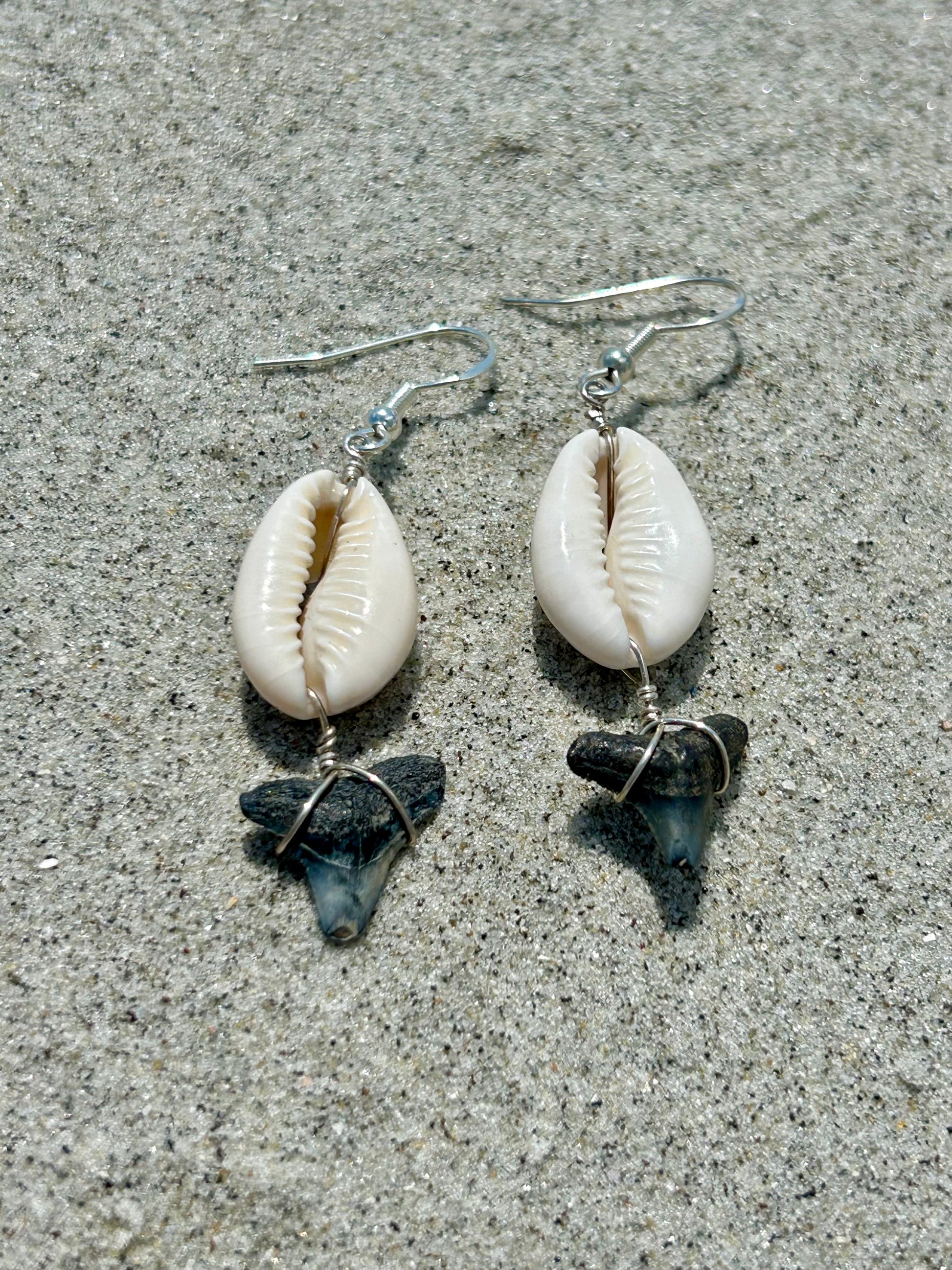 Shark Tooth Fossil with Cowrie Shell Gemstone Sterling Silver Dangly Earrings
