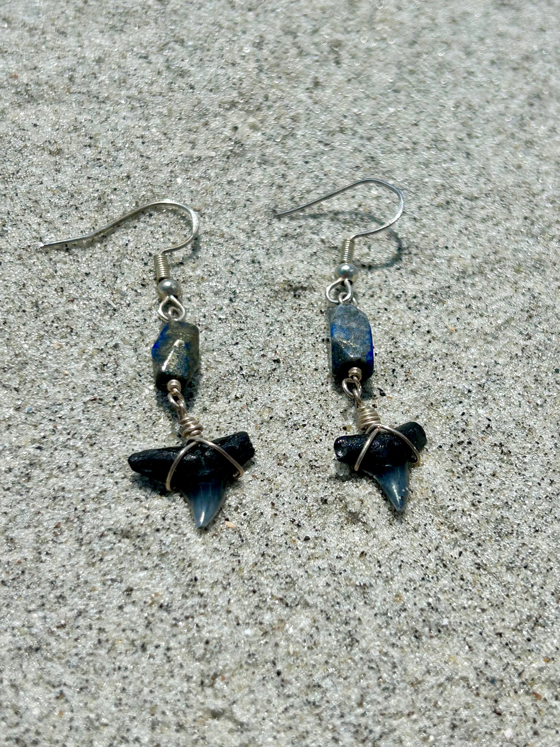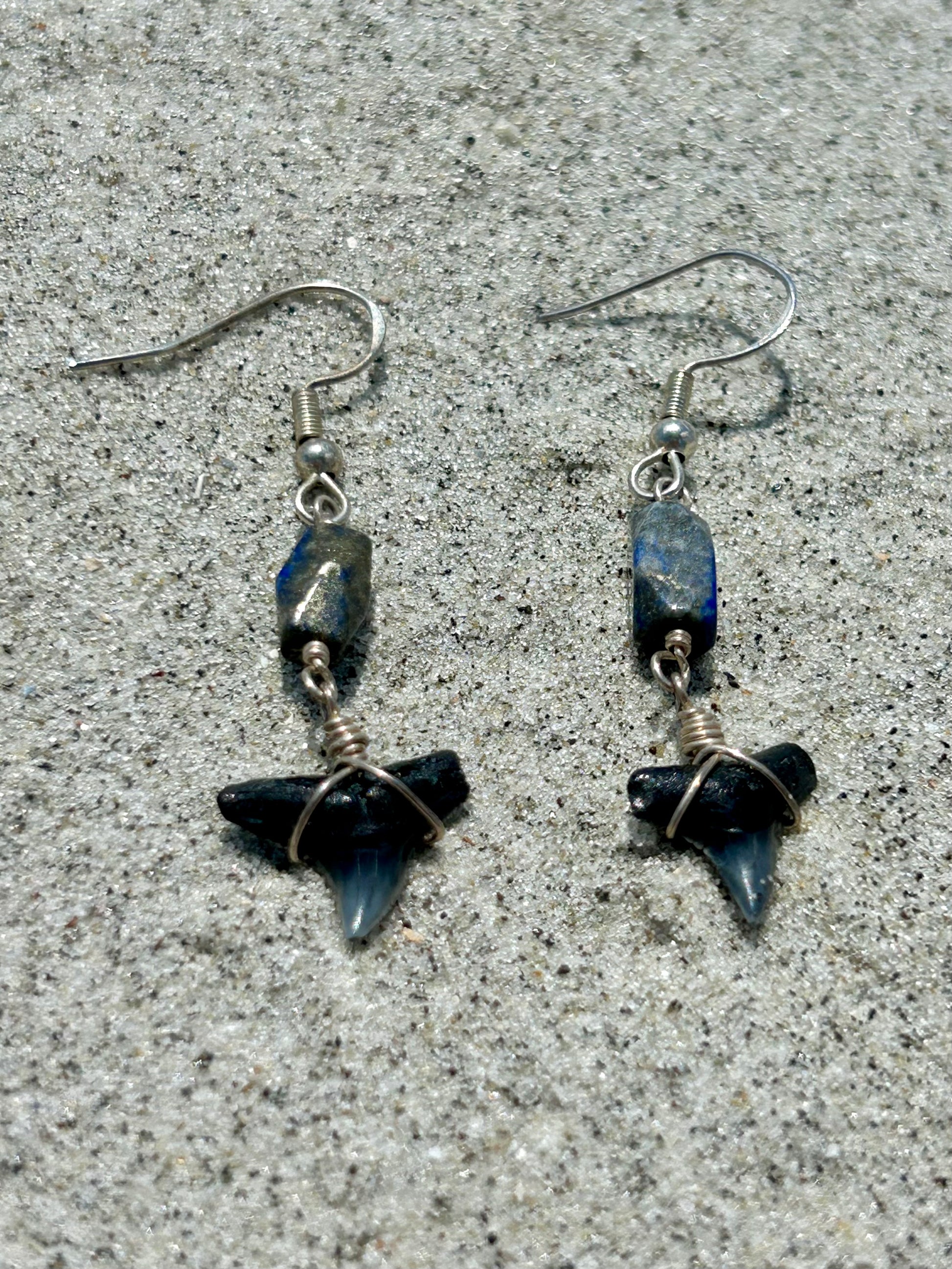 Shark Tooth Fossil with Lapis Lazuli Gemstone Sterling Silver Dangly Earrings