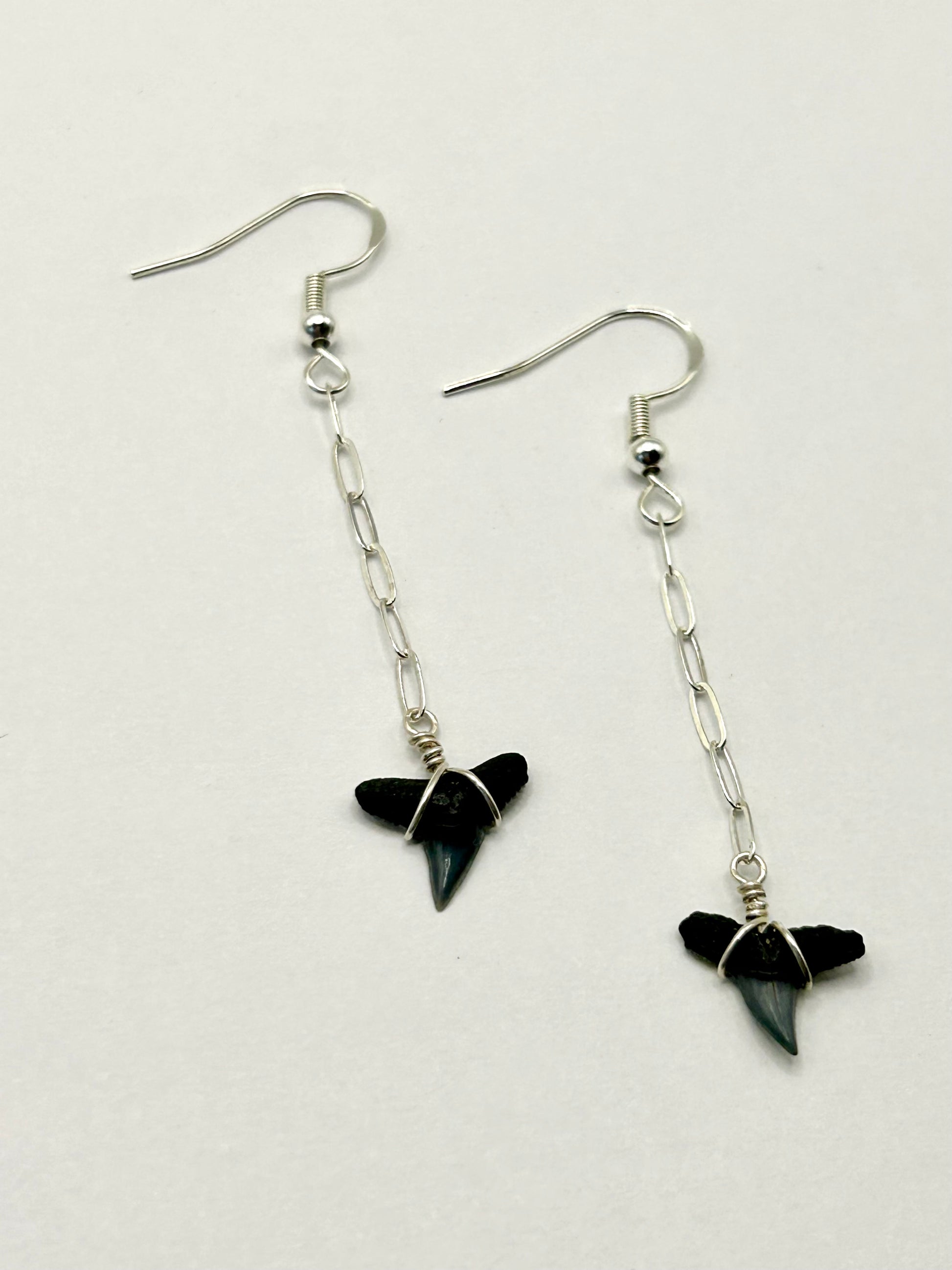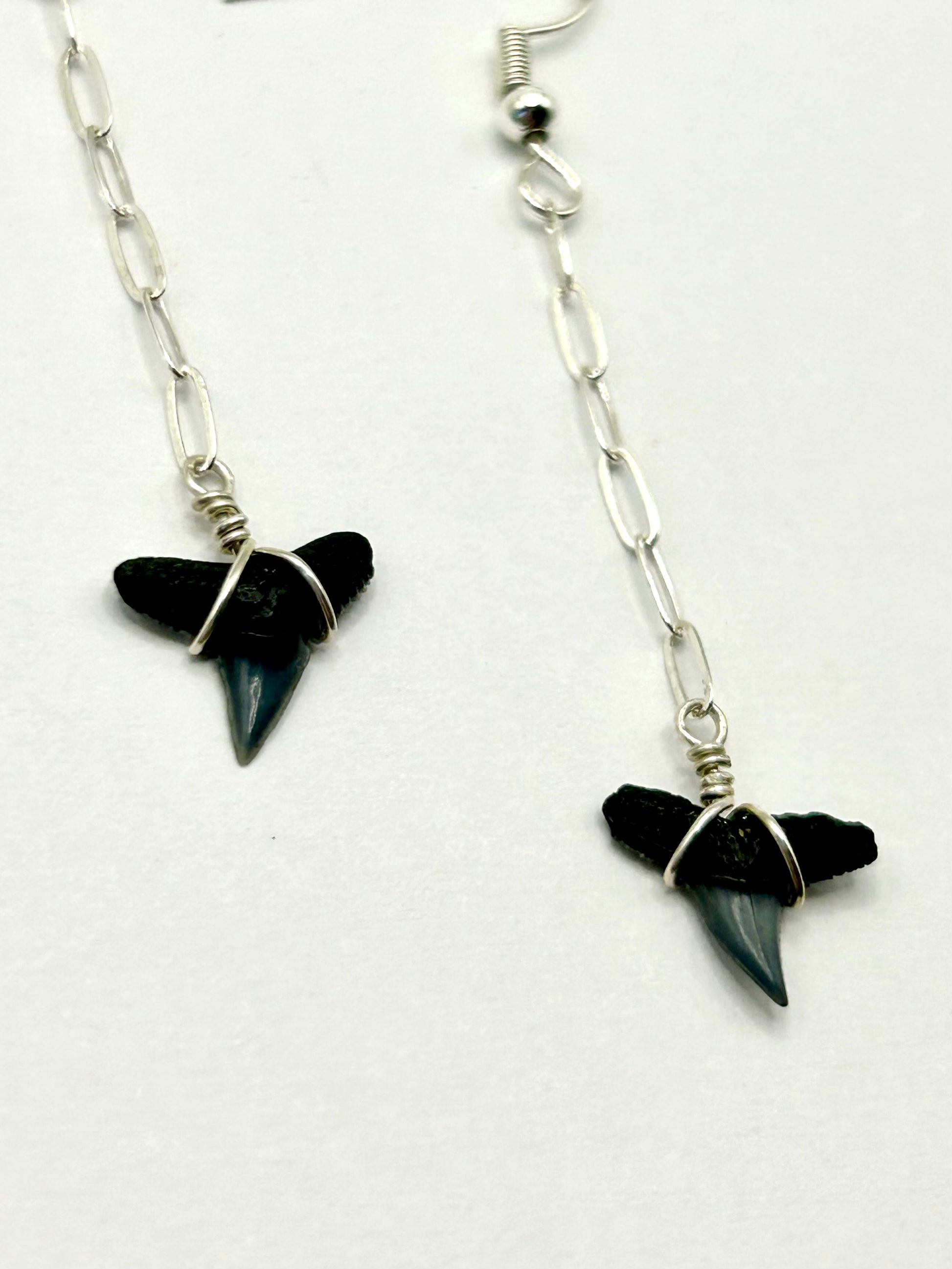 Shark Tooth Fossil with Paperclip Chain Sterling Silver Dangly Earrings