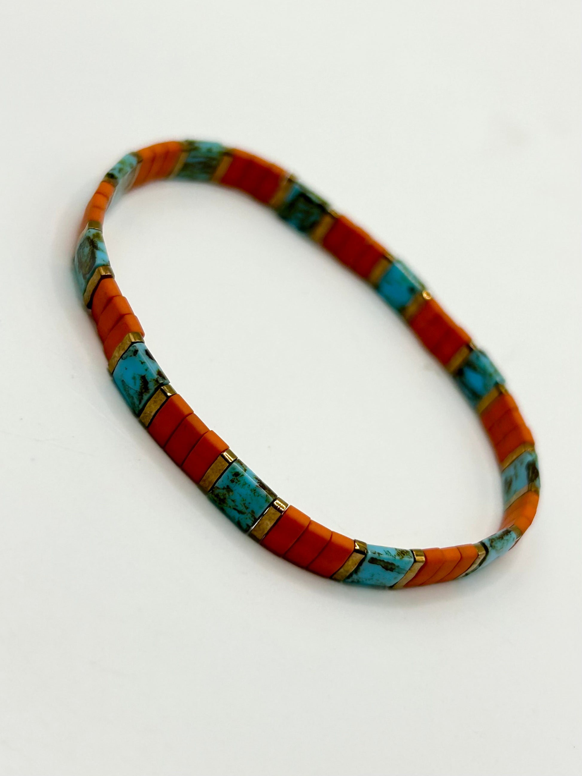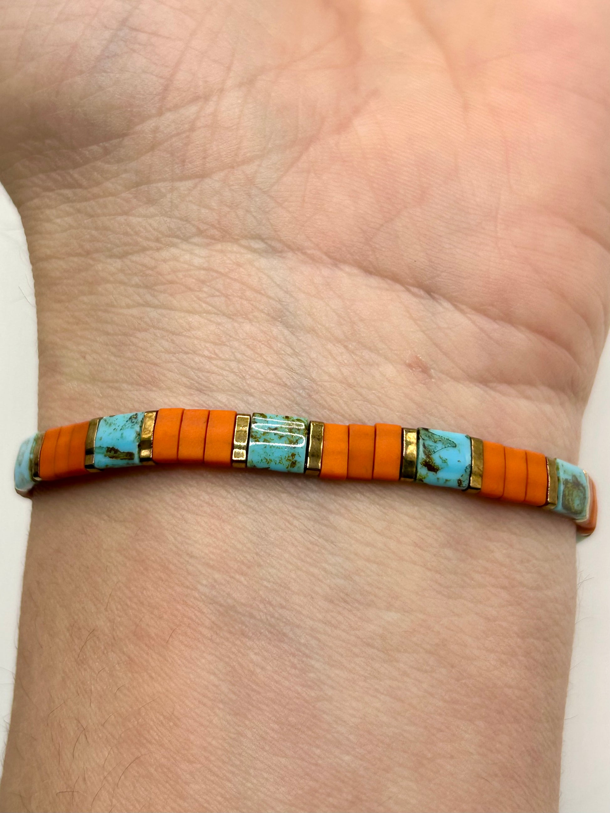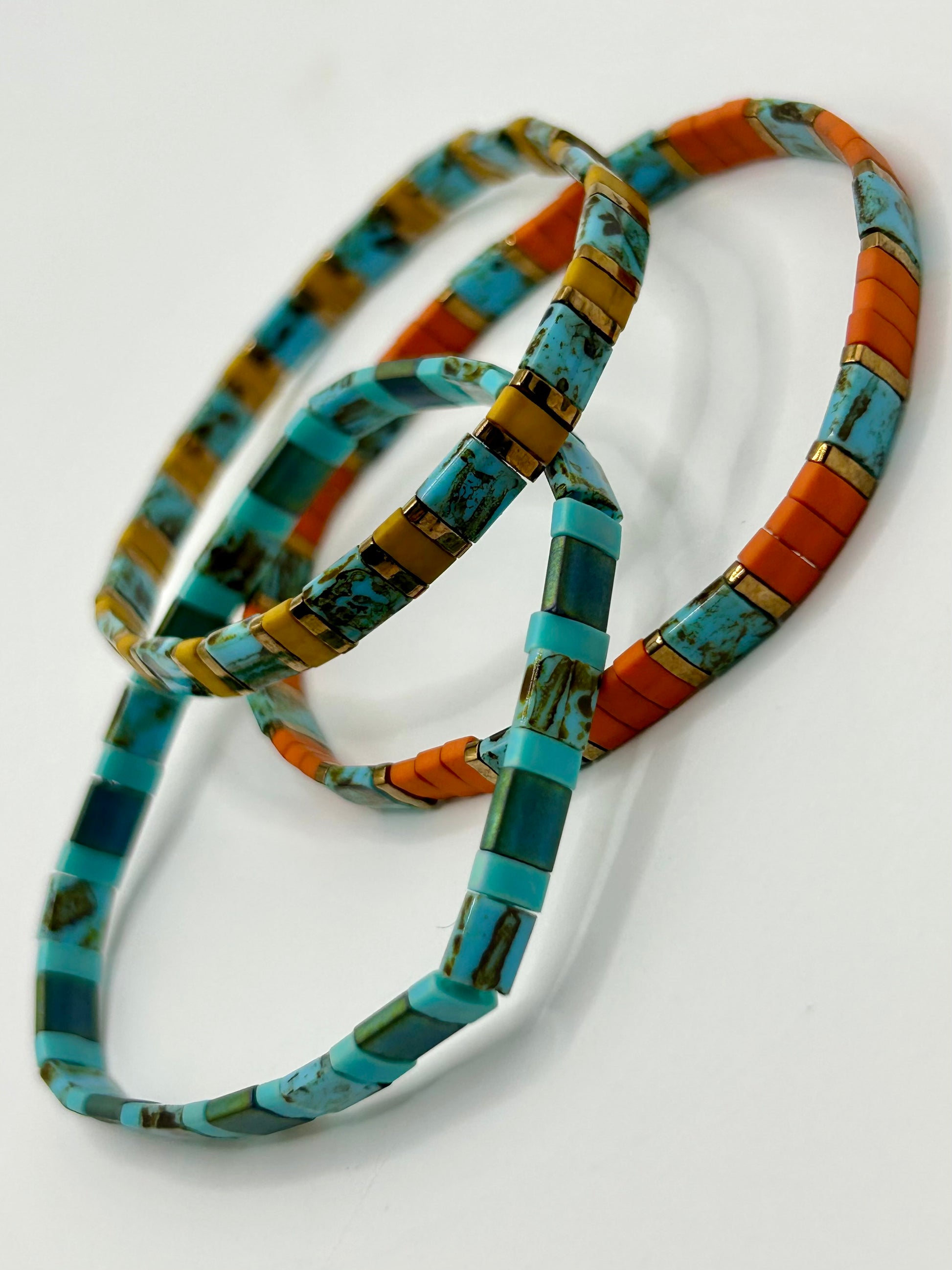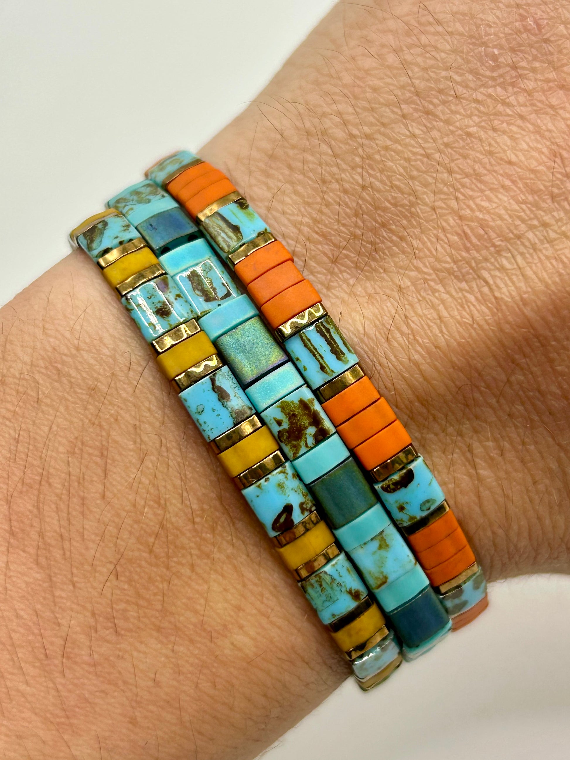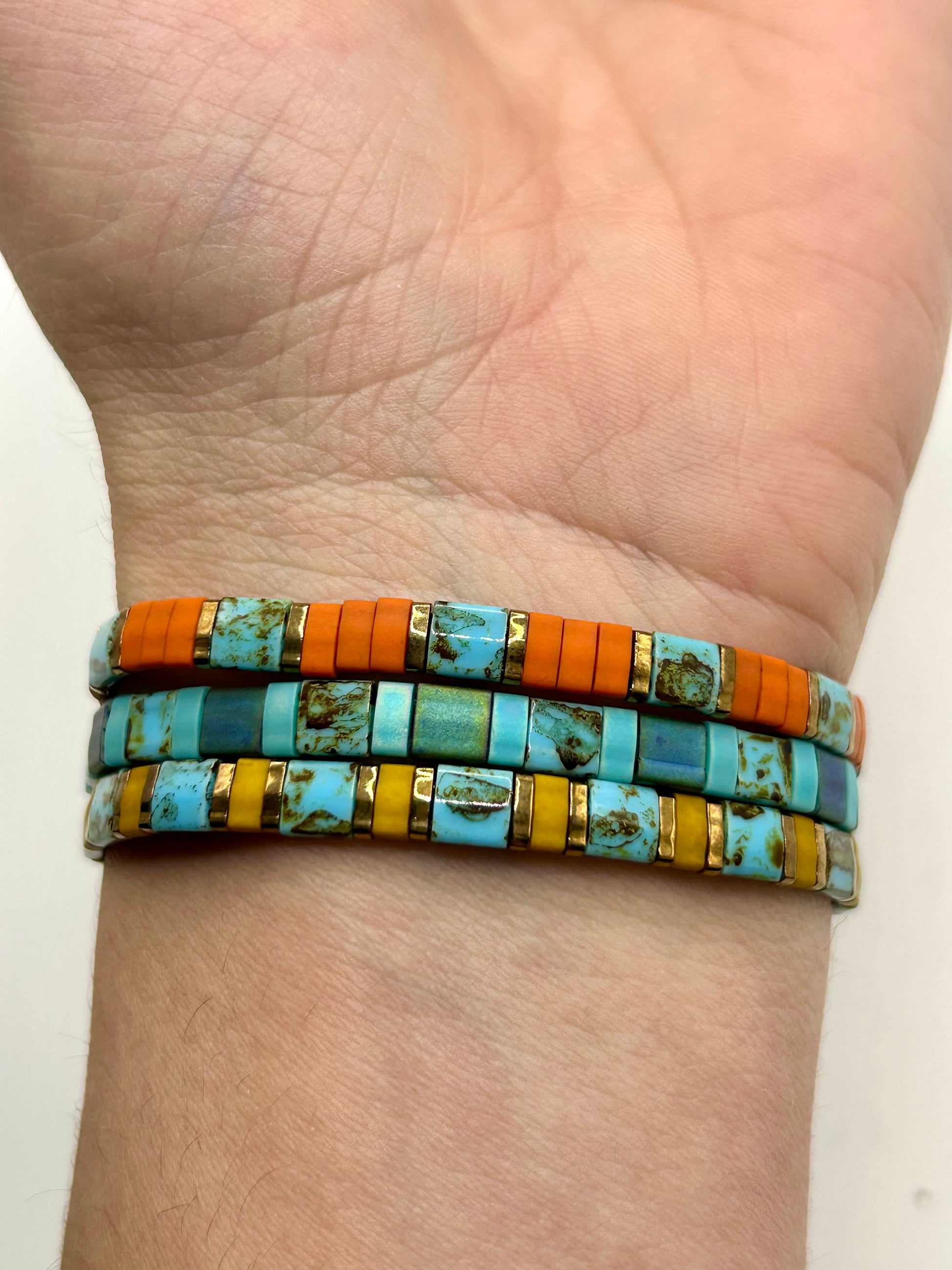 Sunset Turquoise Tila Glass Bead Elastic Bracelet Collection