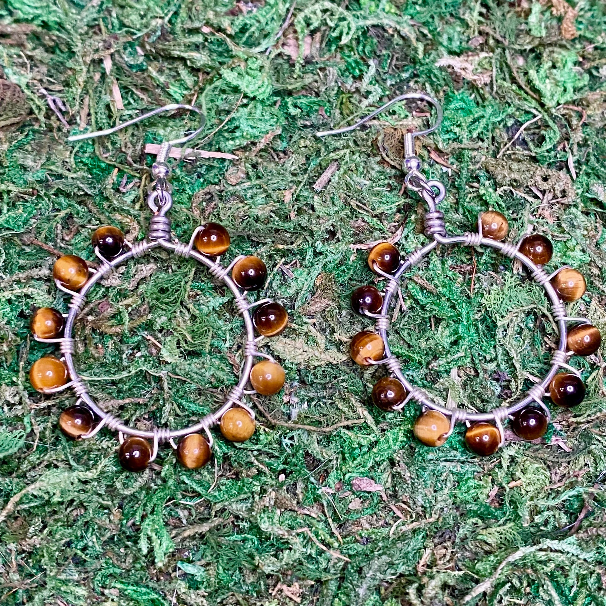 Dangly wire wrapped hoop earrings with tiger’s eye gemstone beads