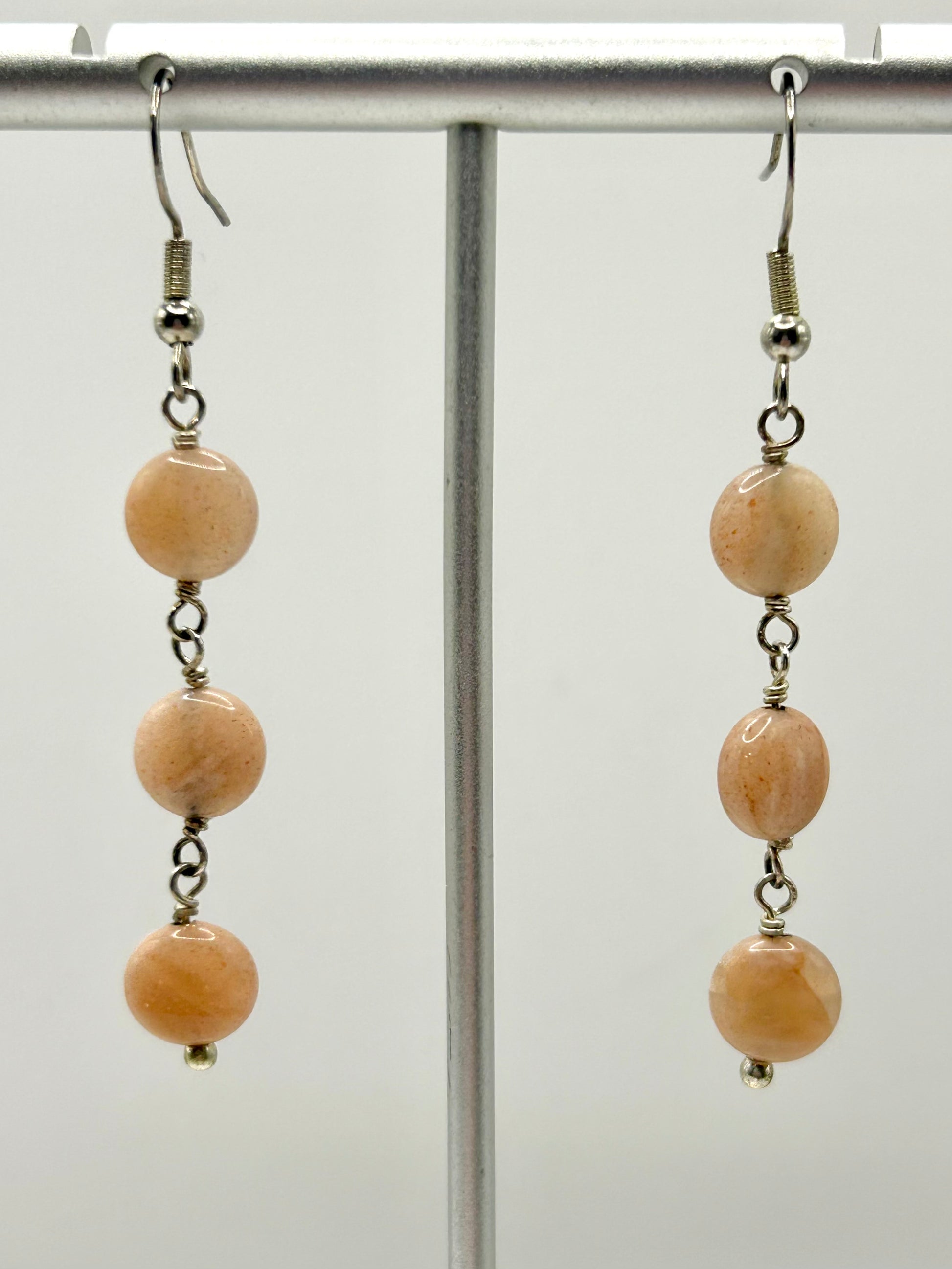Dangly wire wrapped earrings with triple Peach Moonstone coin gemstones